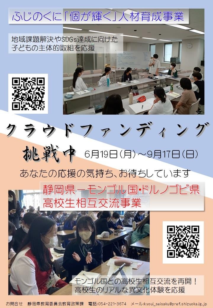 静岡県教育委員会は、6月19日(月)から、2つの事業に対して同時にクラウドファンディングを実施します。地域課題解決やSDGs達成に向けた子どもの主体的取組を応援する「ふじのくに『個が輝く』人材育成事業」と、静岡県からの高校生派遣は4年ぶりとなる「静岡県-モンゴル国・ドルノゴビ県高校生相互交流事業」の2つの事業が対象です。より良い社会を創造する力を育むこうした取組に賛同し、協力していただける方を募集しています。