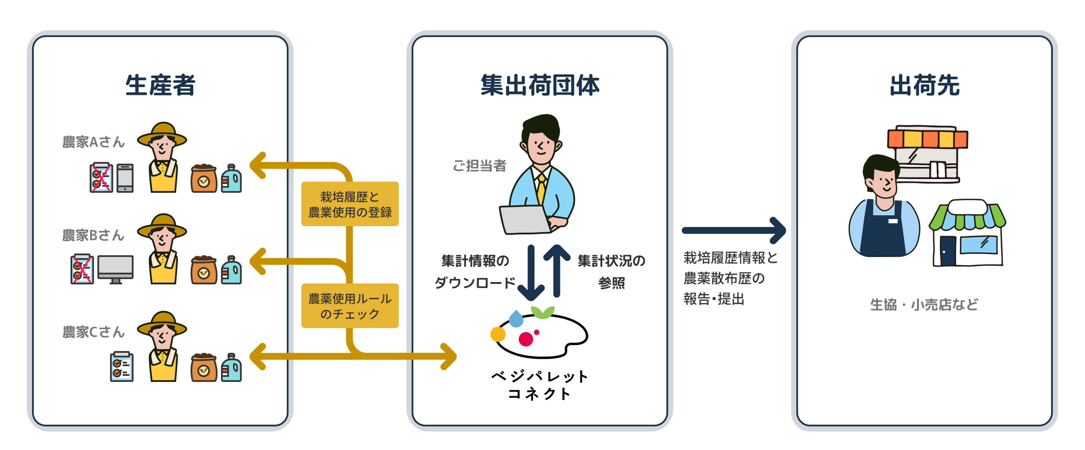 「ベジパレットコネクト」は、生産者が入力した栽培情報をクラウド上で一元管理し、農薬・肥料のルール遵守状況を自動チェックするサービスです。これまで集出荷団体が膨大な時間を費やしてきた「栽培履歴簿」の目視確認業務をデジタル化により大幅に効率化。生産者、集出荷団体、出荷先の三方が、より確実かつスピーディーに食の安全を守れる環境を実現します。