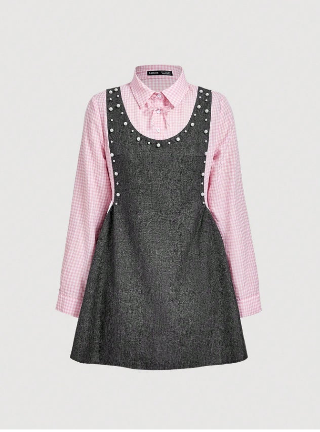 商品名:女性のピンクシャツ&グレータンクドレス、2in1ショートドレス