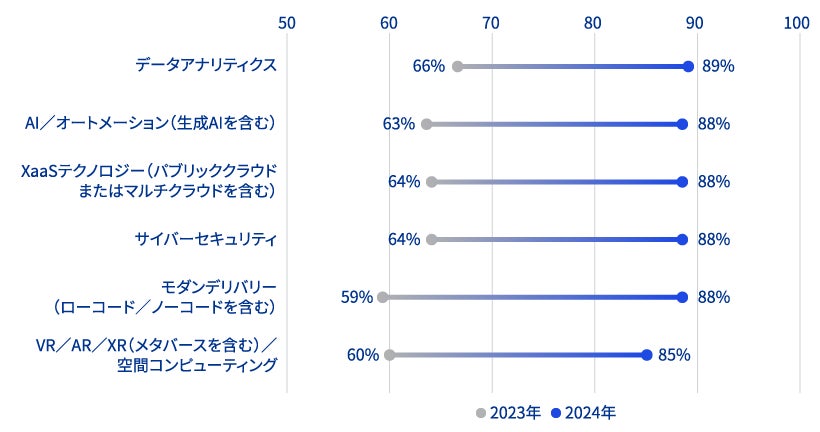●過去24ヵ月間にテクノロジーのすべてのカテゴリーで、平均87%の組織がテクノロジーを利用して利益を増大させました。2023年と2024年の両年で調査の対象となったカテゴリーでは、これらのシステムが自社の収益性にプラスの影響を与えてきたと回答した上級管理職の数が、前年比で25%増加しました。