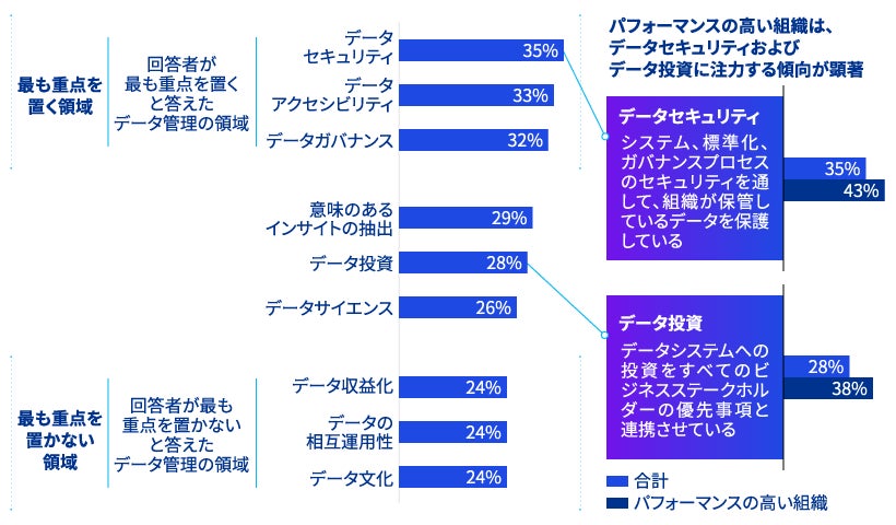 ●組織は、データのセキュリティ(第1位)、アクセシビリティ(第2位)、ガバナンス(第3位)を優先事項としており、高いレベルのデータ活用能力を実現するために、組織はより強力なコンプライアンスプログラム、フレームワーク、および役割に関する明確な分担と責任体制の構築を通して、高度なデータのセキュリティ、ガバナンス、アクセシビリティを追求しています。