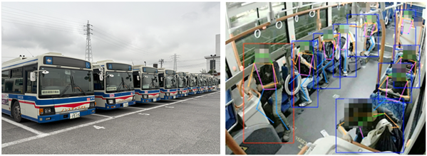 バス乗員安全システムは車内に複数設置したカメラで取得した映像をAIで解析し、乗客が走行中に席を立つなどの怪我につながる不安全行動を検知します。さらに、車両情報(乗降口開閉、車速など)を組み合わせて解析し、状況に応じた運転士への通知や乗客への案内・注意喚起を行うことで、安心・安全な公共交通の実現に貢献します。今回発売するβ版では、国内路線バスにおける主要3車種への搭載が可能です。