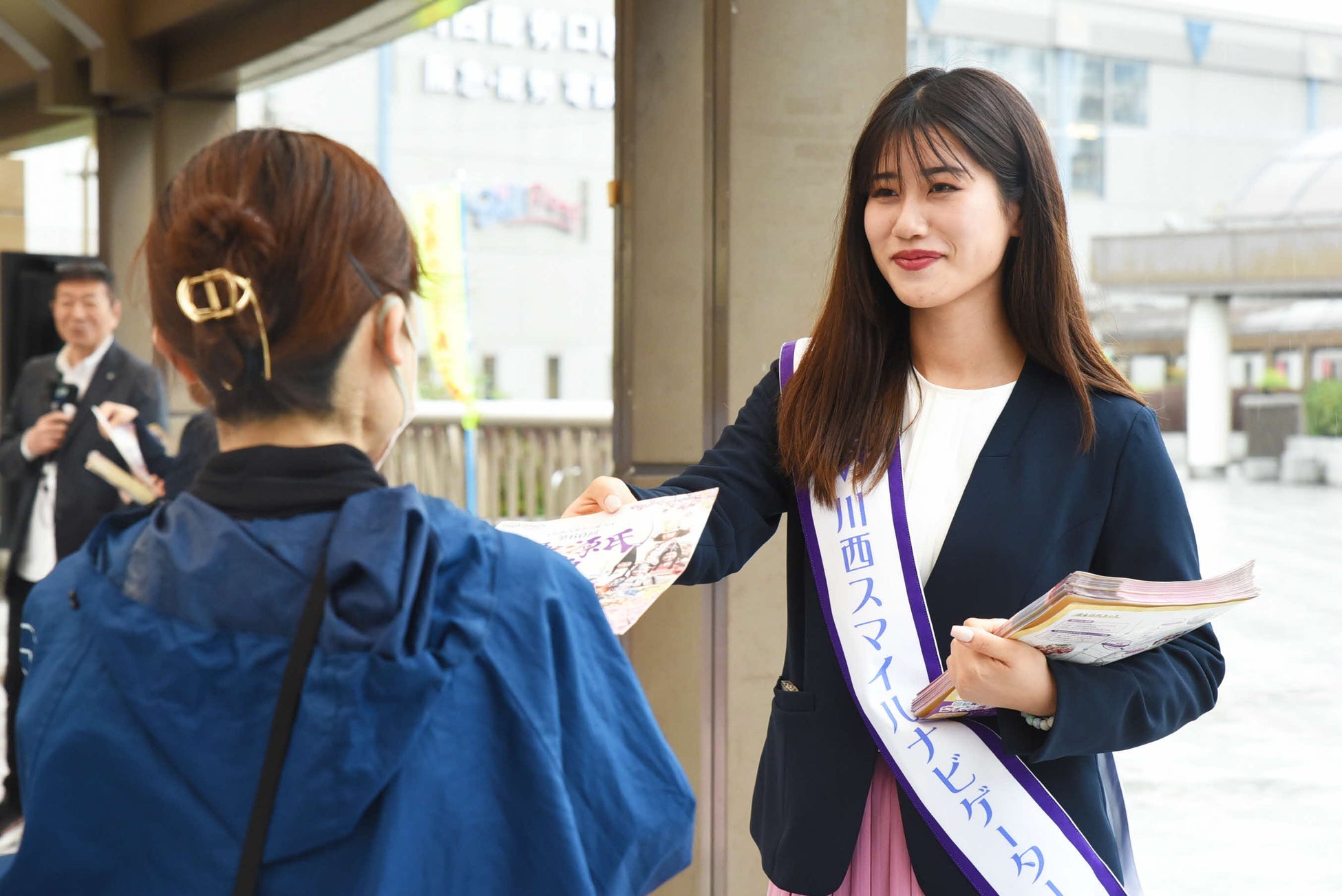表敬訪問の後、3人は4月14日(日)に開催する「清和源氏まつり」をPRするため、阪急川西能勢口駅南側デッキの上で、往来する人々に笑顔でパンフレットを手渡しました。