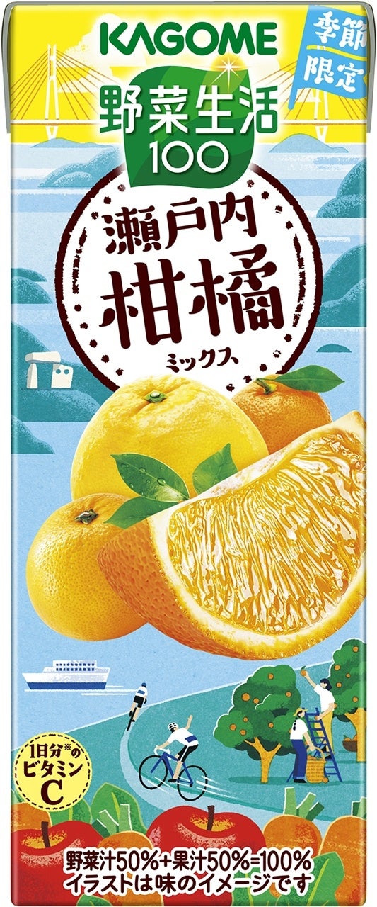 「野菜生活100 瀬戸内柑橘ミックス」は、暖かな陽ざしと、瀬戸内海の海風をたっぷり受けた土壌で育まれた甘くてジューシーな瀬戸内産柑橘7種(うんしゅうみかん、はっさく、ネーブルオレンジ、清見、河内晩柑、ポンカン、レモン)の味わいの野菜・果実100%ミックスジュースです。砂糖不使用で、1日分※のたっぷりビタミンCを摂ることができます。朝食のおともやリフレッシュしたいときにおすすめです。