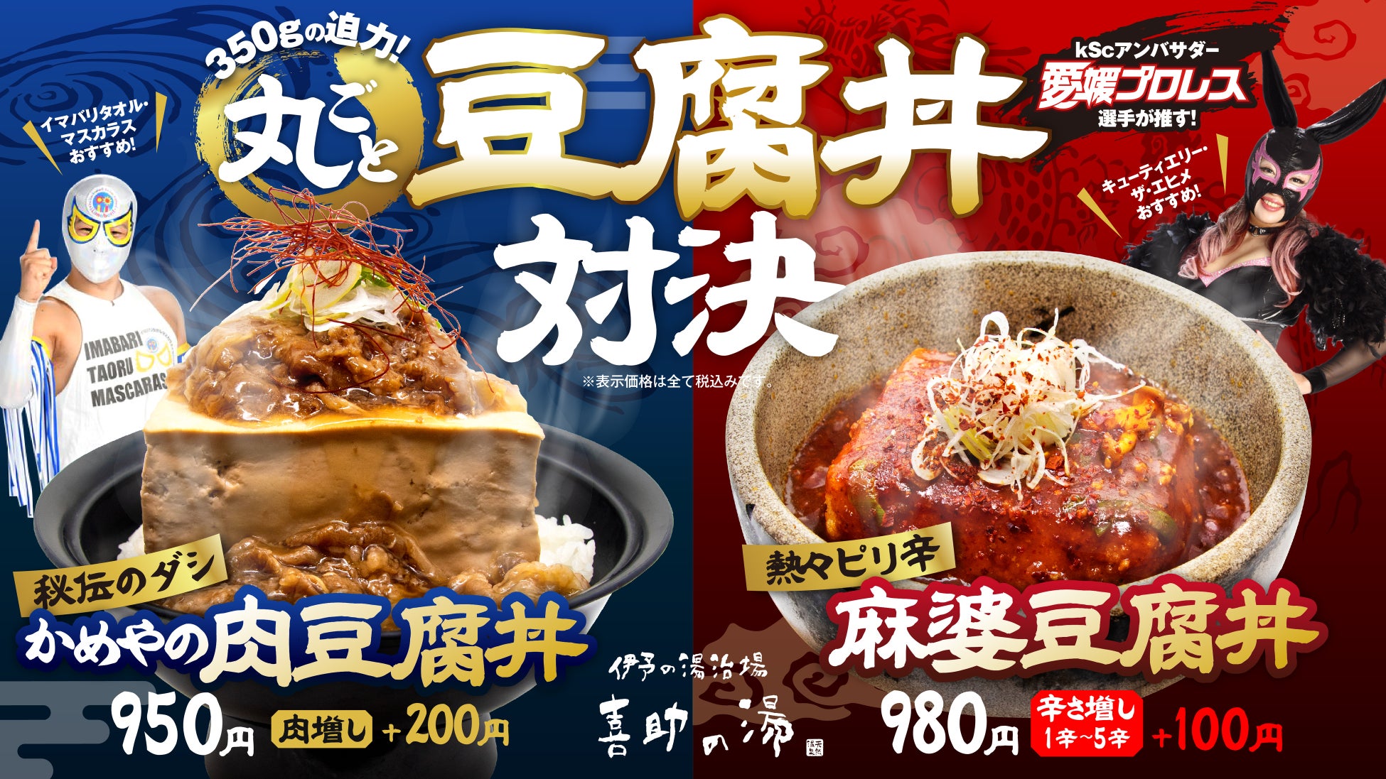 キスケ株式会社(本社:愛媛県松山市、代表取締役:山路義則)が運営する「伊予の湯治場 喜助の湯」は、2025年3月7日「サウナの日」に合わせ、サ飯VSシリーズ第4弾として【丸ごと豆腐丼対決】の販売を開始します。今回は、350gの豆腐を丸ごと1丁使ったインパクト抜群の丼ぶりが登場! 和の旨味たっぷりの「かめやの肉豆腐丼」と、痺れる辛さがクセになる「麻婆豆腐丼」の2種類がラインナップ。サウナ後の最高の一杯を、ぜひ食べ比べてみてください!