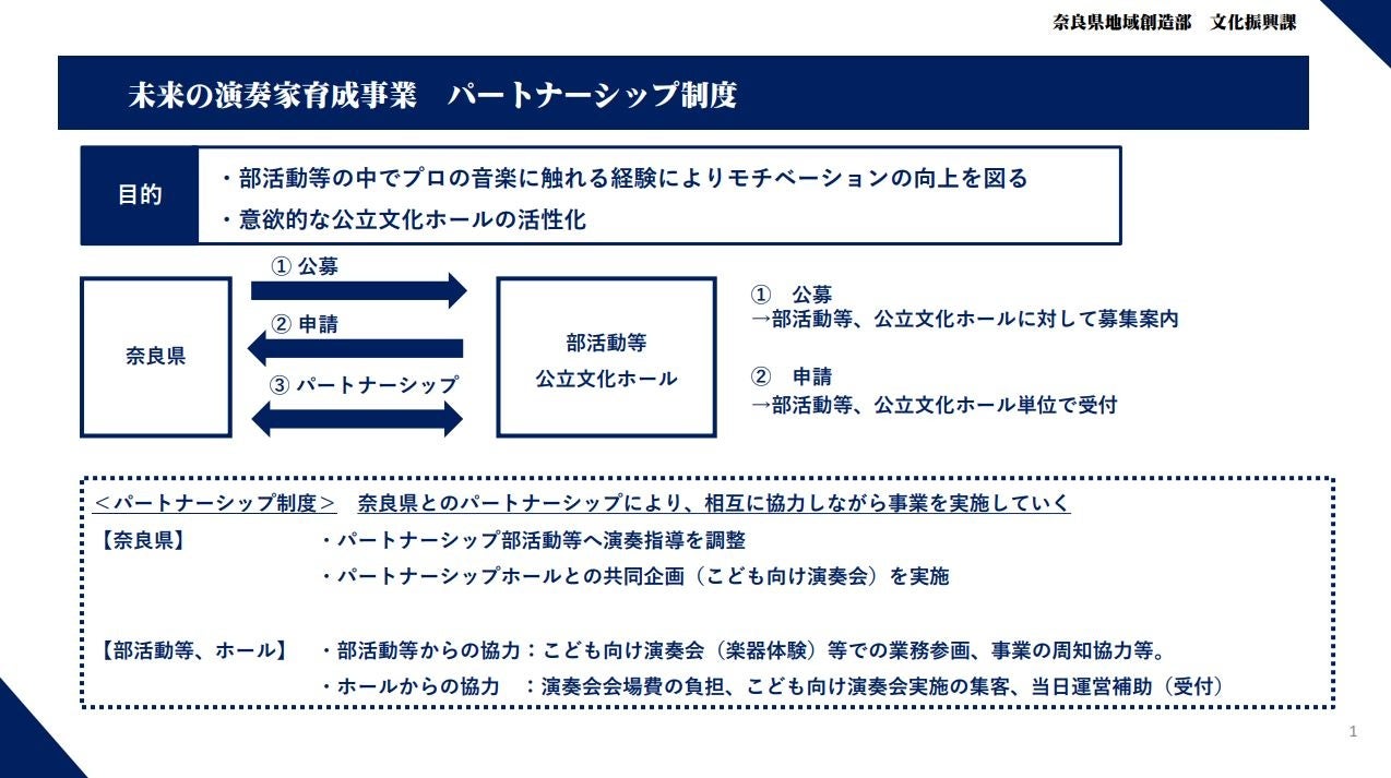 奈良県がJapan National Orchestra株式会社(以下JNO)と協働で実施する「未来の演奏家育成事業」をより充実した事業としていくため、県内学校の部活動や公立文化ホールを対象に、「パートナーシップ制度」を導入しました。