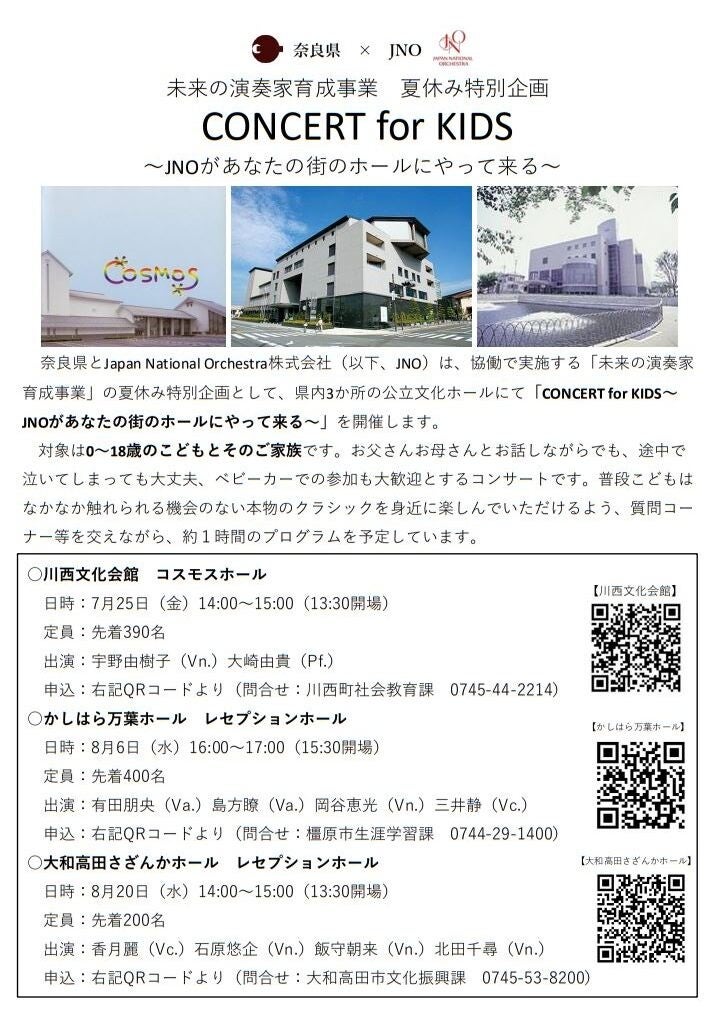 奈良県とJapan National Orchestra株式会社(以下、JNO)は、協働で実施する「未来の演奏家育成事業」の夏休み特別企画として、県内3か所の公立文化ホールにて「CONCERT for KIDS ~JNOがあなたの街のホールにやって来る~」を開催します。