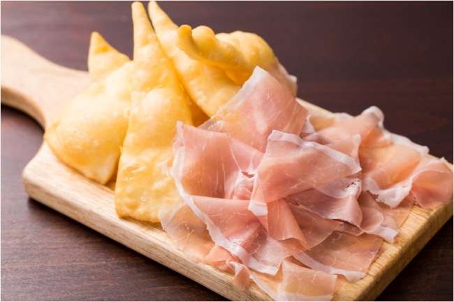 一緒にご提供するお通しの「クレシェンティーナ」はイタリアの伝統的な揚げパン。毎日お店で揚げているので、ふわふわカリカリの状態でお客様の元へ。