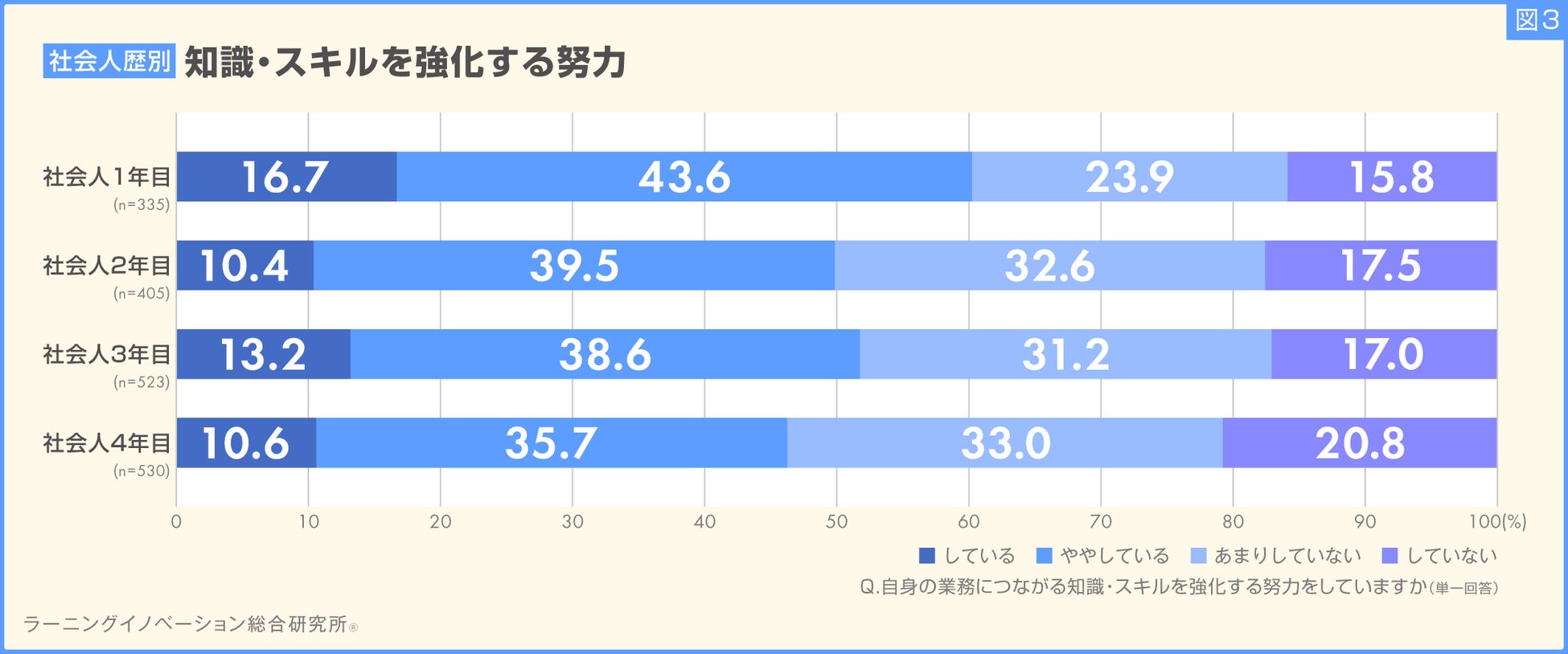 「自身の業務につながる知識・スキルを強化する努力をしていますか」という質問に対し、「している」「ややしている」と答えた割合は、社会人1年目社員は60.3%でしたが、社会人2年目社員は49.9%、社会人3年目社員は51.8%、社会人4年目社員は46.3%でした。知識・スキル強化をしている社会人4年目社員の割合は社会人1年目社員に比べて14.0ポイント低く、業務につながる知識・スキルの強化は社会人1年目社員が最も努力していることがわかりました(図3)。