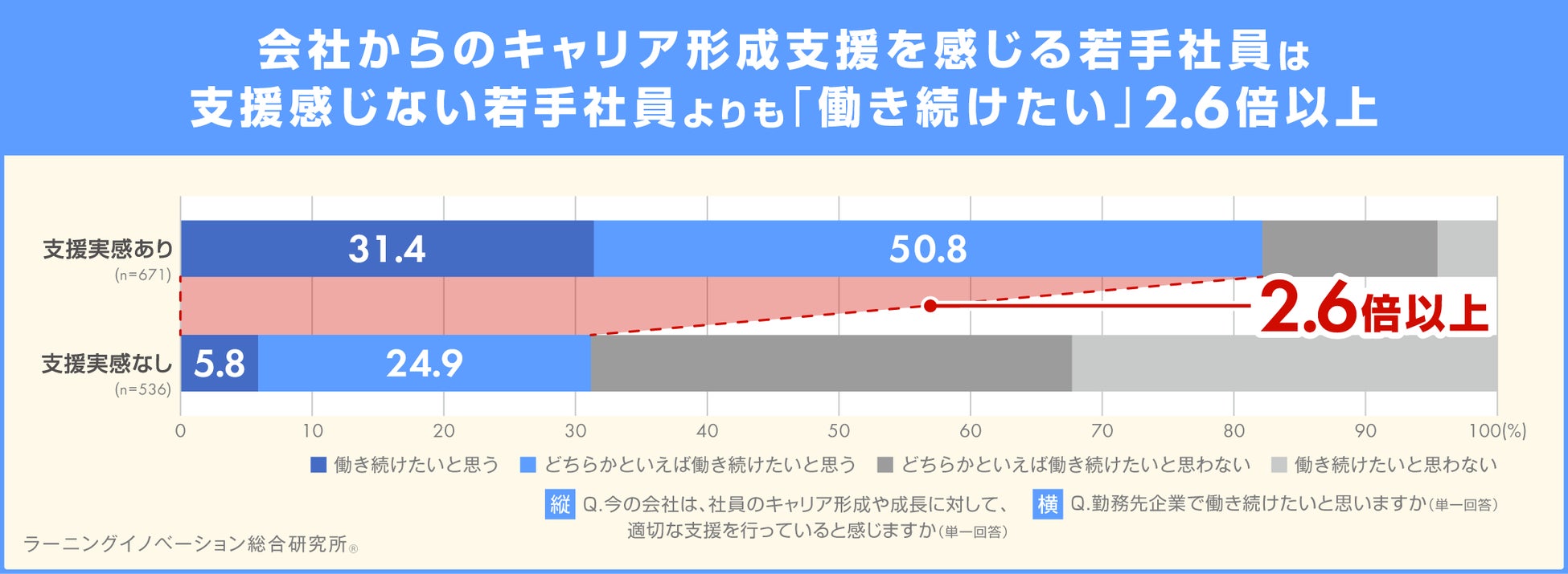 さらに会社からのキャリア形成支援の実感の有無と勤続意向の関係を調べたところ、会社からの支援を感じている若手社員ほど、「働き続けたい」と答える割合が高く、相関関係があることがわかりました。