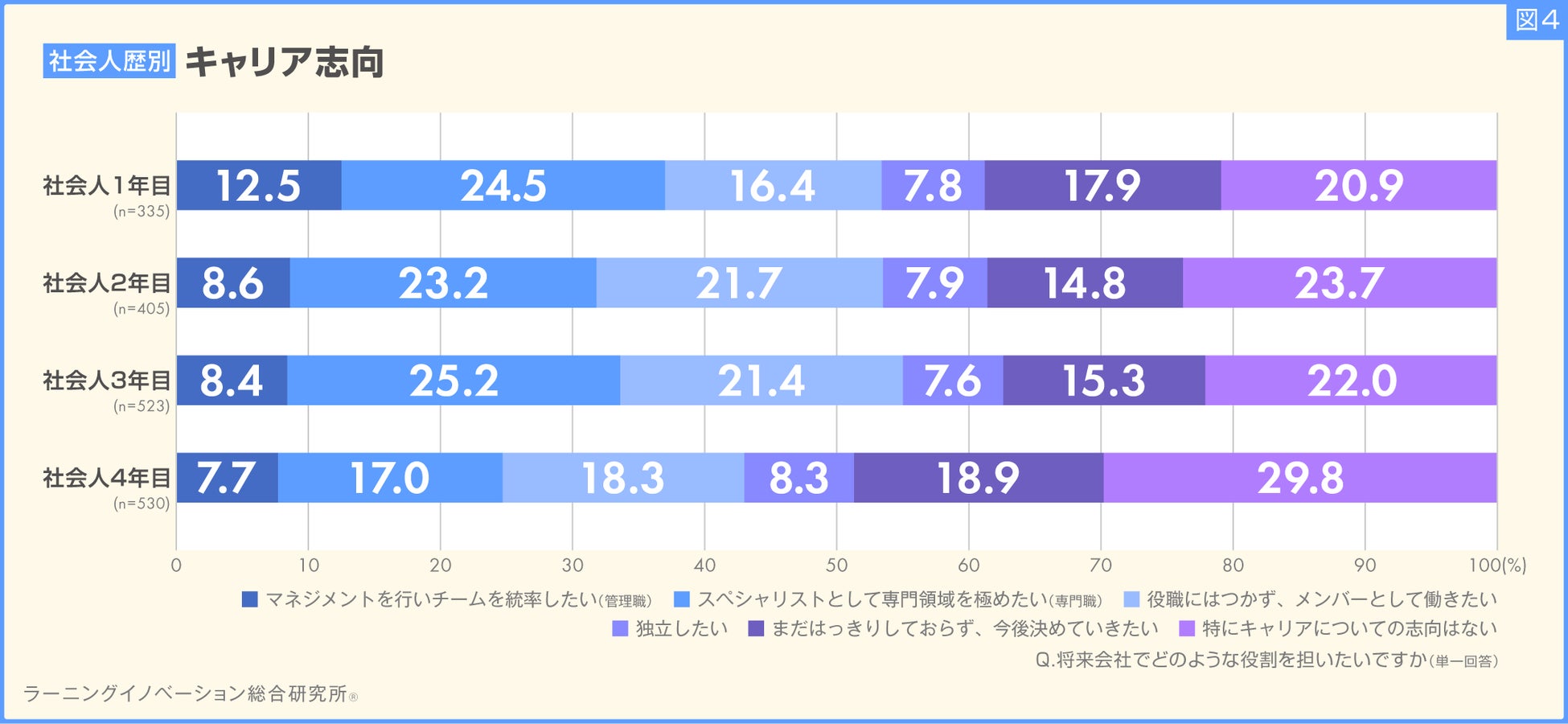 「まだはっきりしておらず、今後決めていきたい」「特にキャリアについての志向はない」の回答割合は、どちらも社会人4年目社員が最も高くなり、その合計は48.7%でした(図4)。