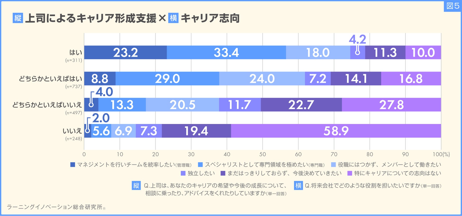 上司からのキャリア形成支援がある若手社員ほど、管理職・専門職を目指す割合が高い(図5)