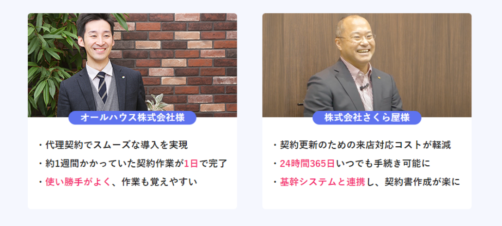 いえらぶGROUPが提供する不動産業専用の電子契約サービスです。賃貸借契約の締結・更新・解約業務をオンライン上で完結することを可能にします。弊社が提供する基幹システム「いえらぶCLOUD」に依存せず、現在ご利用の基幹システムと連携してご利用いただけます。