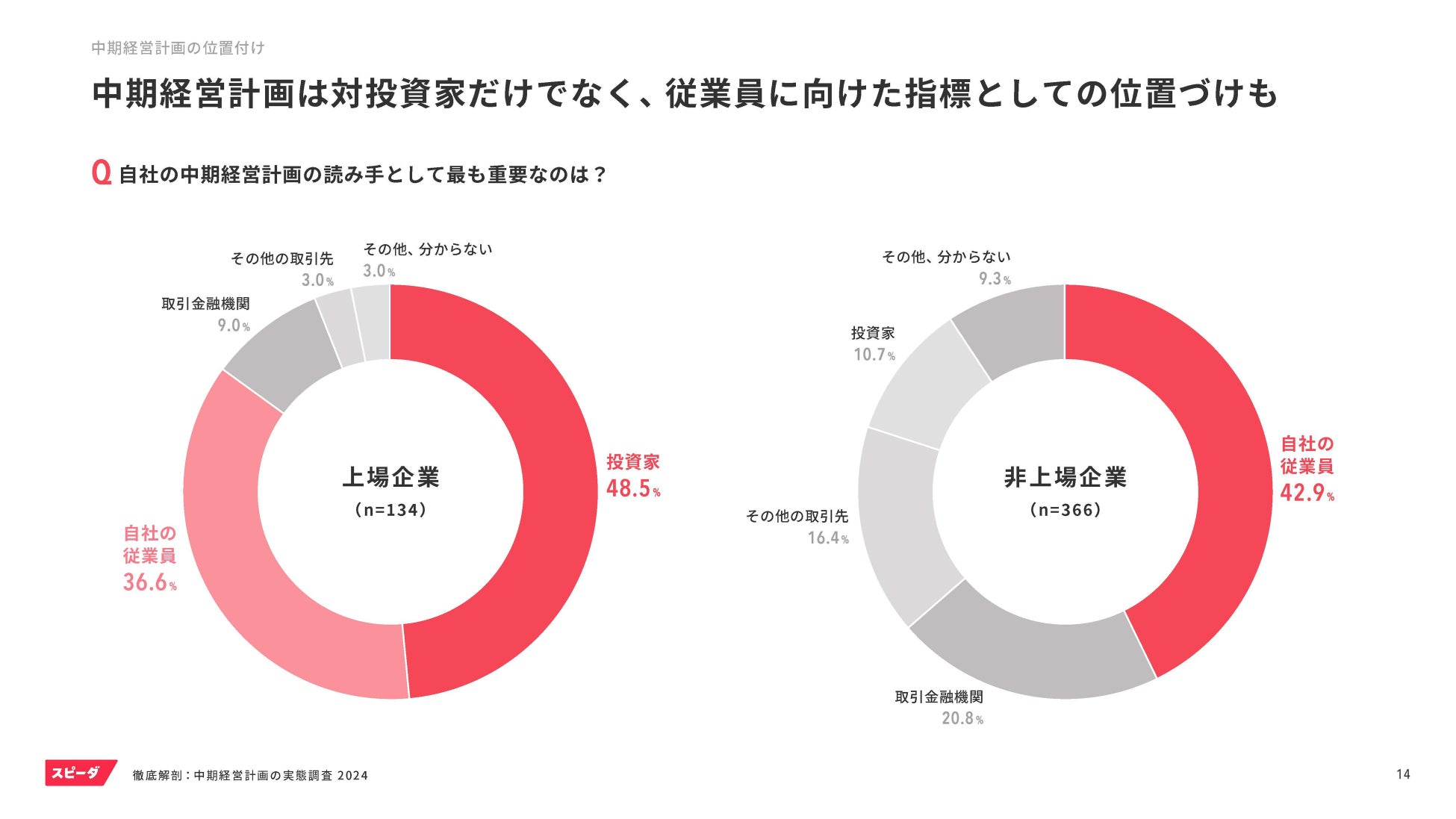 また、中期経営計画は投資家向けに策定されることが多いと思われがちですが、上場企業/非上場企業ともに約4割が従業員向けに策定しており、社内外の広いステークホルダーに向けた重要なメッセージと位置づけていることが分かります。
