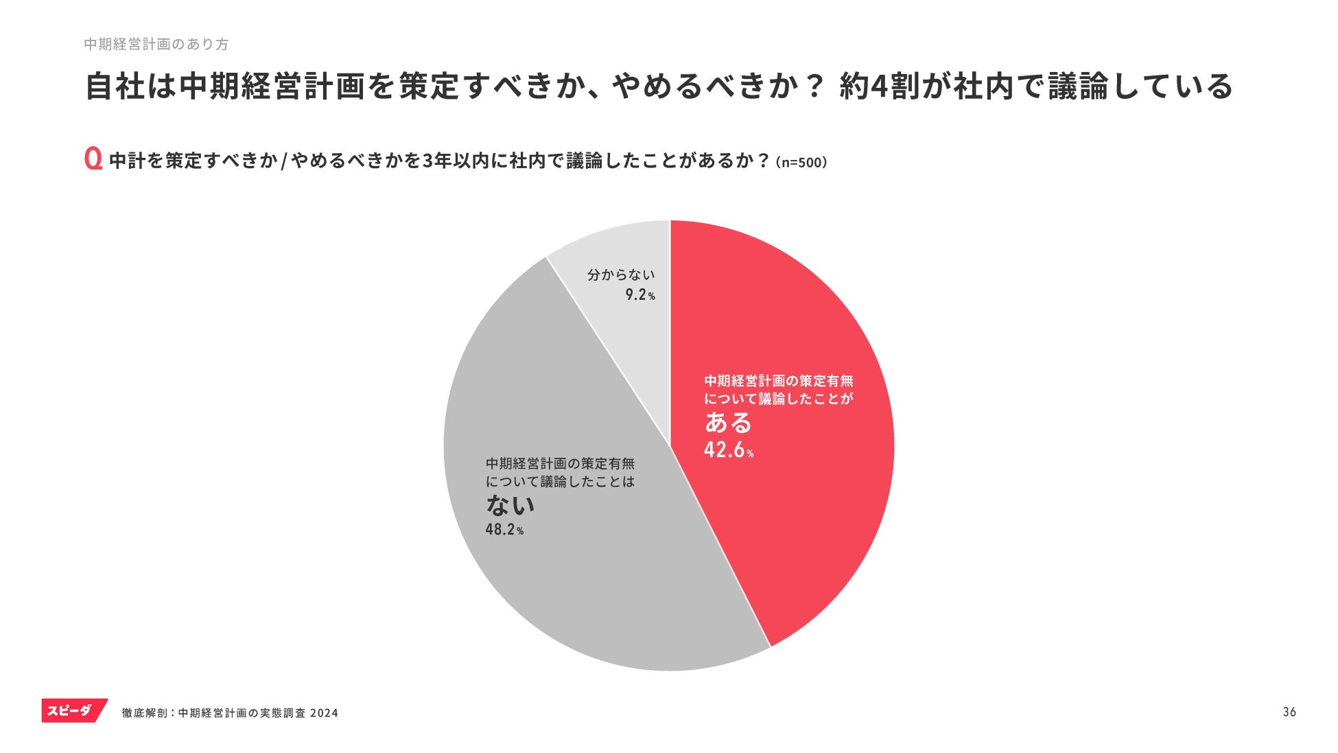 数年先を見通すことの難しさや上述の業務負荷の大きさも相まって、調査対象500名のうち約4割が「中期経営計画を策定すべきか、やめるべきかについて議論したことがある」と回答しており、中期経営計画の位置づけやあり方が今後変わっていく可能性も浮かび上がってきました。