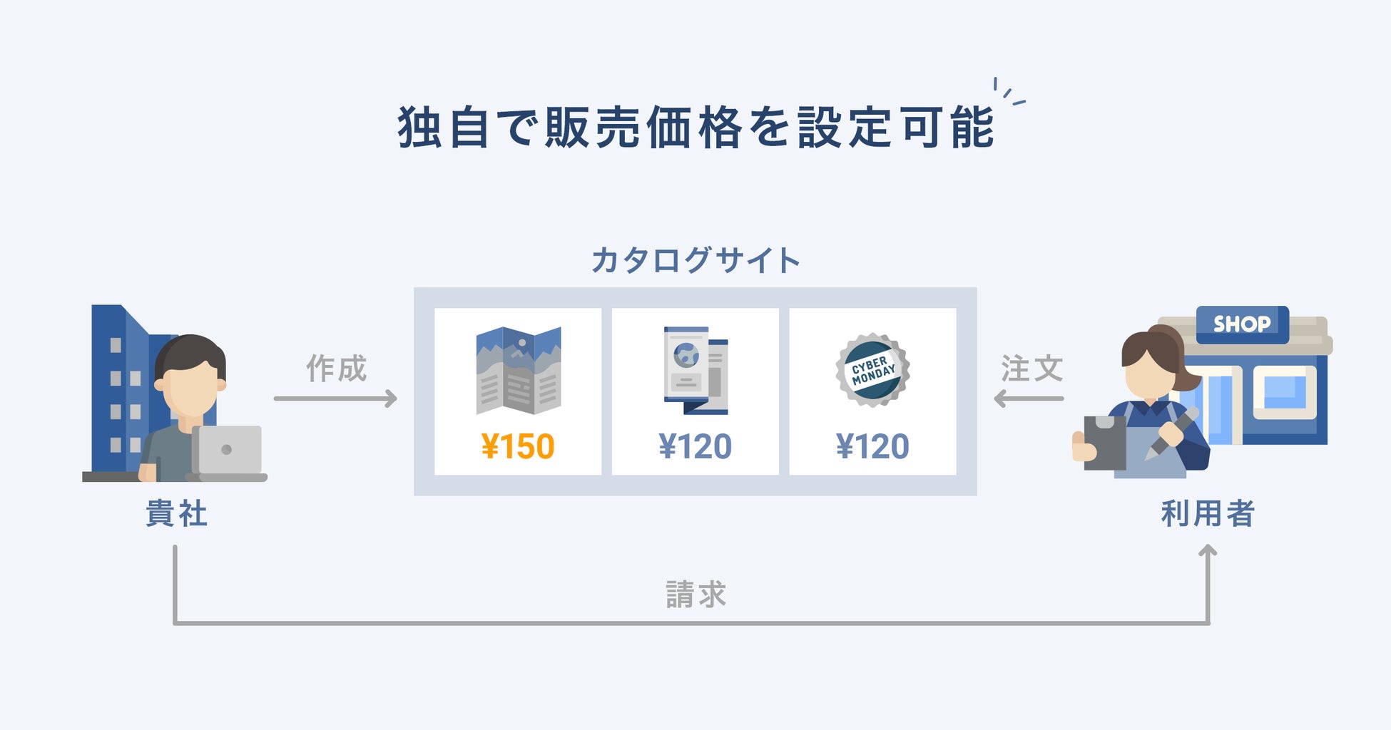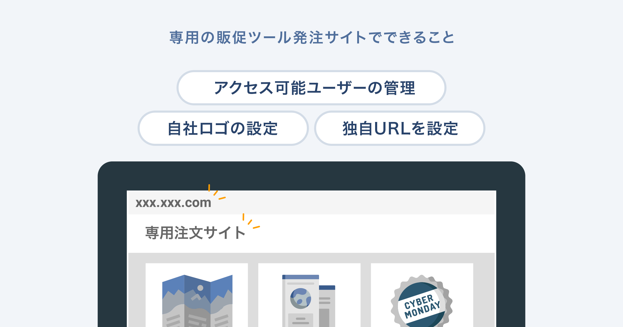 印刷物・販促物の発注はご利用者様毎に権限の異なるアカウントを発行できるため、情報セキュリティ上でもご安心いただけるよう、開発しております。また、各アカウント別に販促物の販売金額を自由に個別設定できるため、統括部門にて販売手数料を得ることができます。