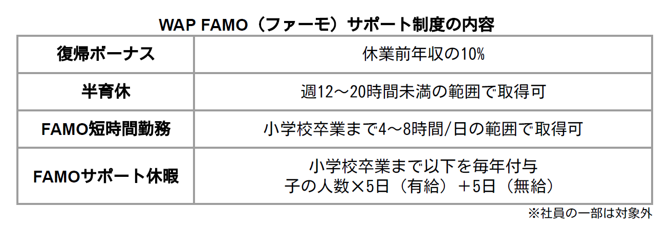 - 性別問わず子を持つ社員を支援する「FAMOサポート」