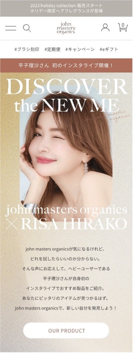 平子理沙さんが日常的に使用しているレコメンド製品の紹介や、インスタライブの詳細、スペシャルコラム「Living with john masters organics」を掲載予定です。