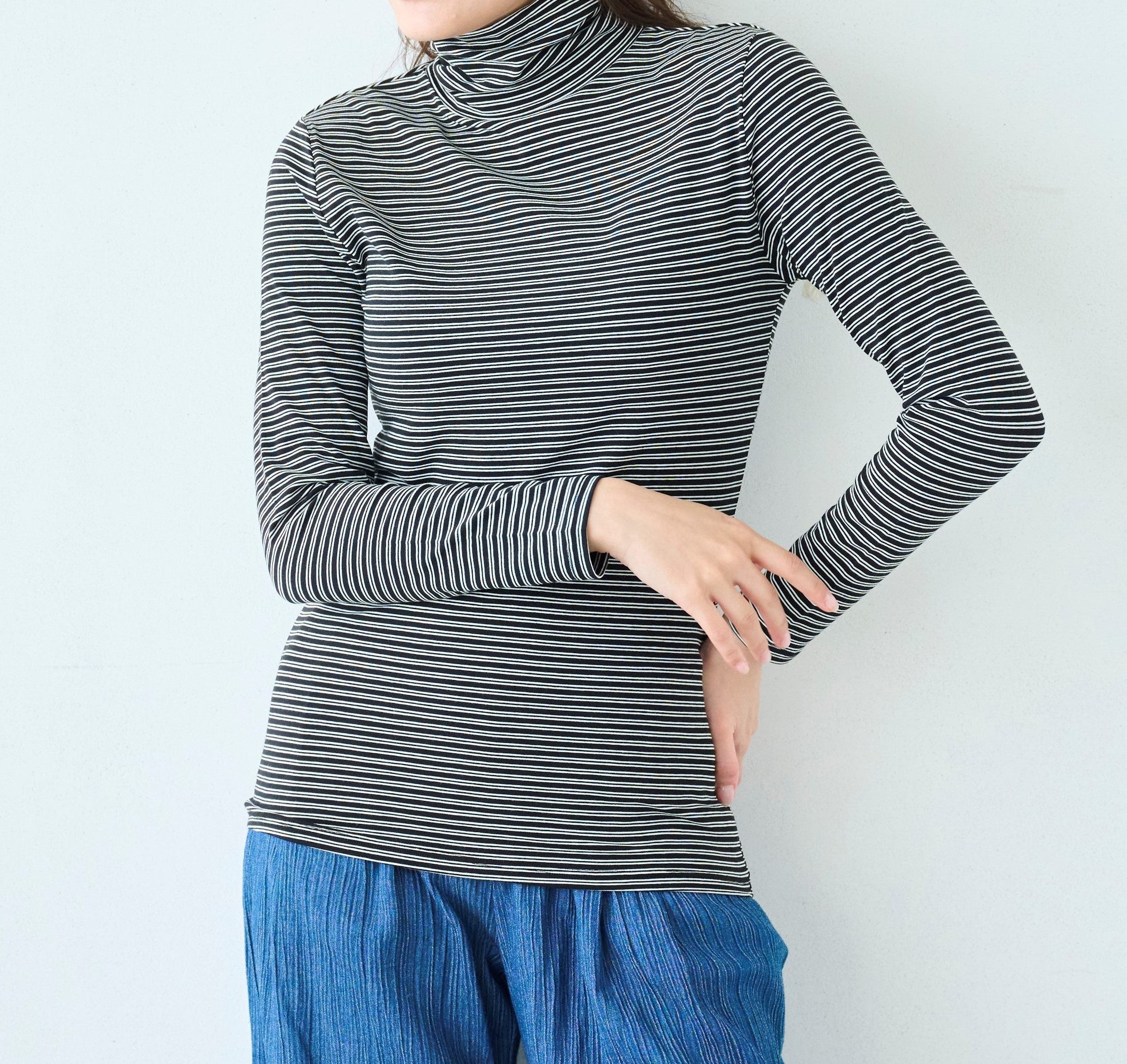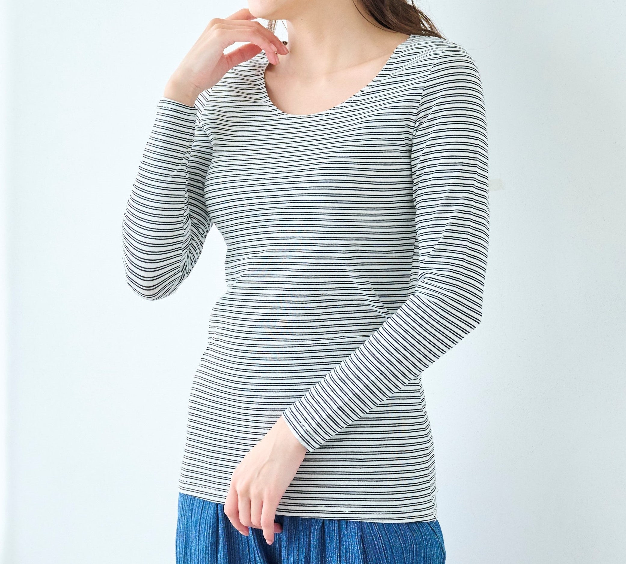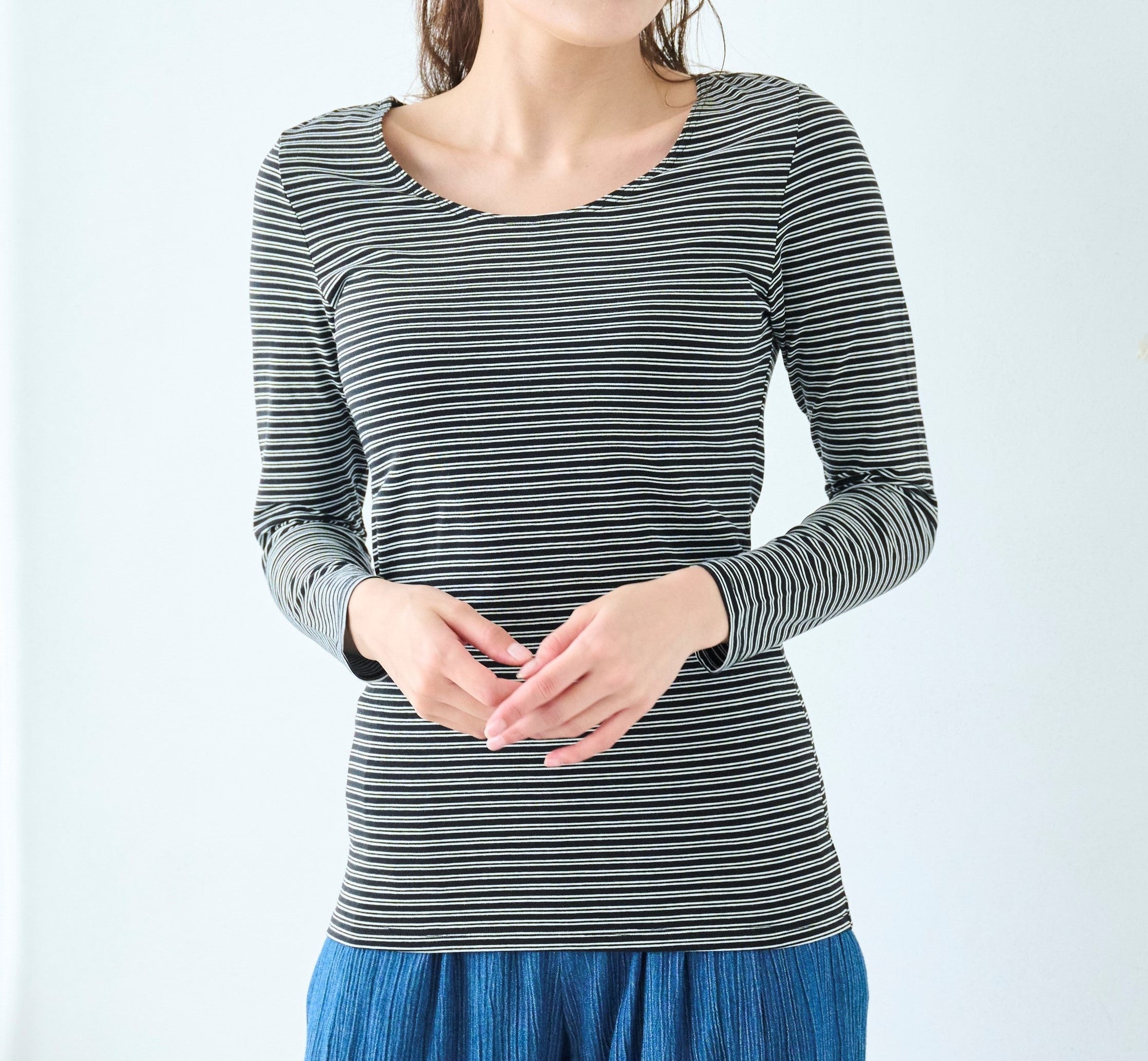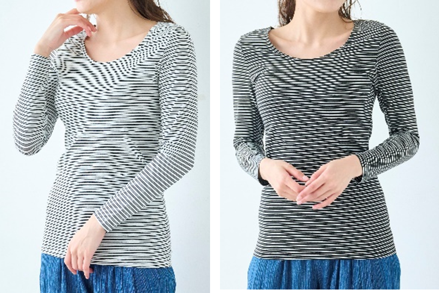 ベルメゾンでは、常にお客様の声に耳を傾け、商品開発を行っています。お客様からのレビューや、コールセンターに寄せられたご意見をもとに、今回新たにボーダー柄を追加しました。どんな服にも合わせやすい、ブラックとオフホワイトを組み合わせた細ピッチのボーダー2種で、大人の女性がカジュアルに楽しめるデザインです。コーディネートのアクセントとして重ね着したり、インナーとして取り入れたりすることで、さりげないおしゃれを楽しむことができます。