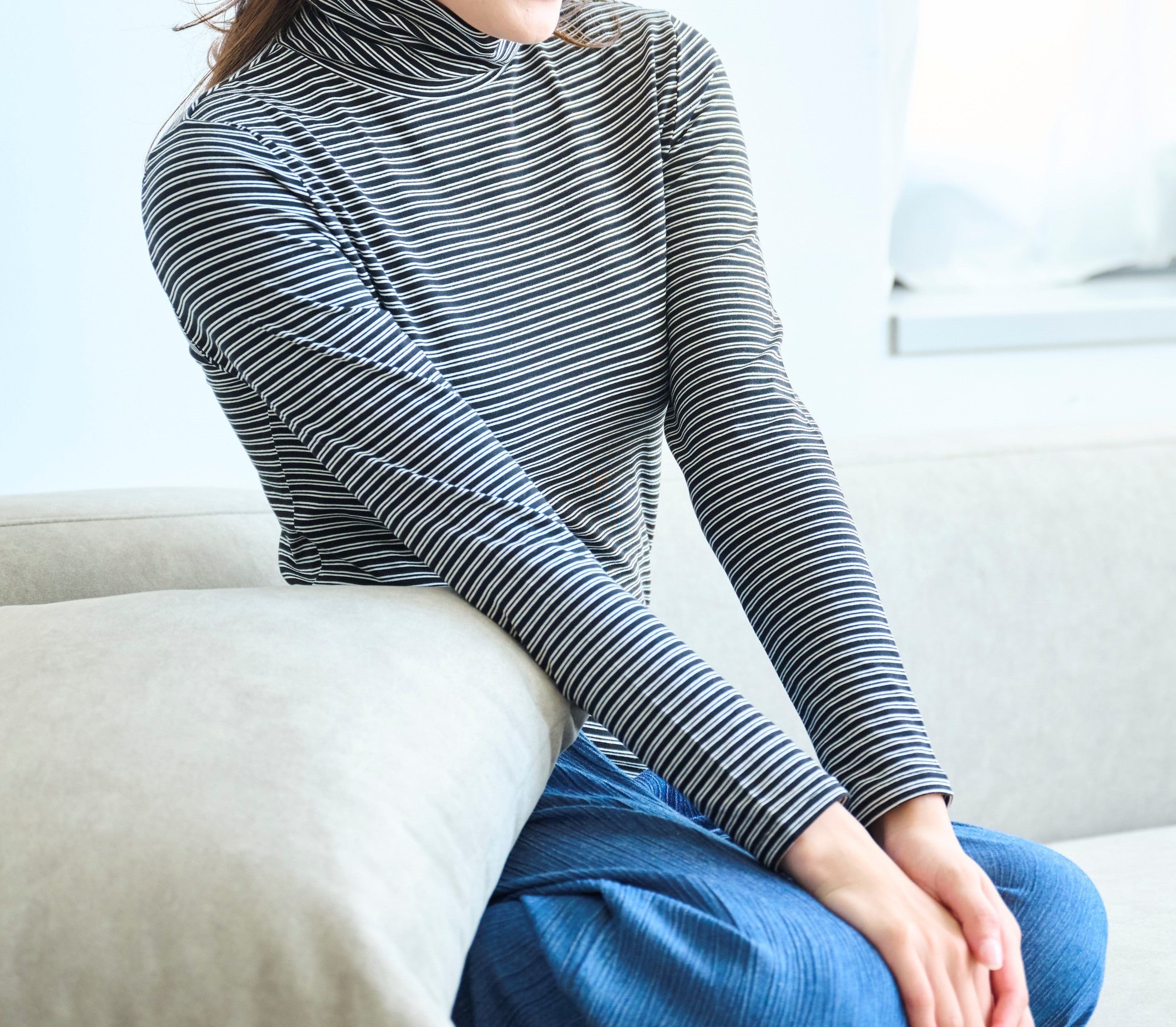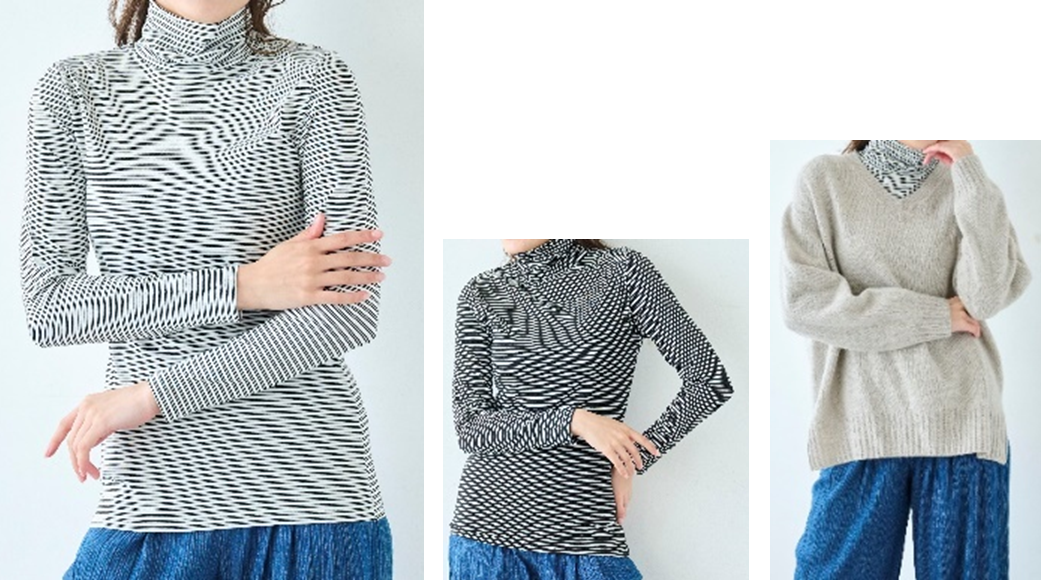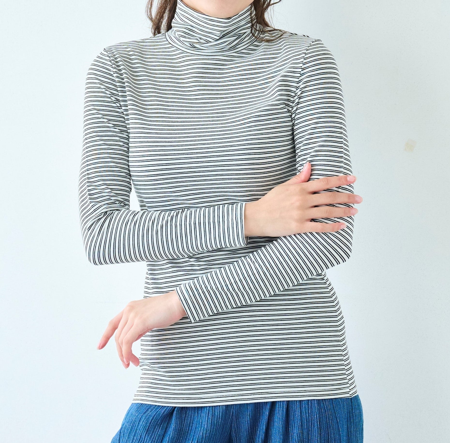 ベルメゾンでは、常にお客様の声に耳を傾け、商品開発を行っています。お客様からのレビューや、コールセンターに寄せられたご意見をもとに、今回新たにボーダー柄を追加しました。どんな服にも合わせやすい、ブラックとオフホワイトを組み合わせた細ピッチのボーダー2種で、大人の女性がカジュアルに楽しめるデザインです。コーディネートのアクセントとして重ね着したり、インナーとして取り入れたりすることで、さりげないおしゃれを楽しむことができます。