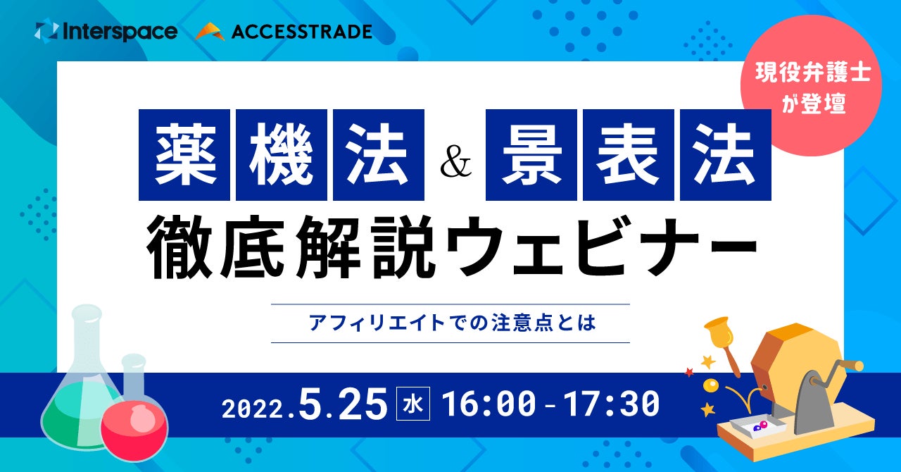 インターネット広告・メディア運営事業の株式会社インタースペース(所在地:東京都新宿区、代表取締役社長:河端伸一郎、証券コード:2122、以下インタースペース)の運営するアフィリエイトサービス「アクセストレード」は、一般社団法人薬機法医療法規格協会/全国薬機法医療法弁護士協会と、アフィリエイター向けに薬機法&景表法を徹底解説する無料ウェビナーを2022年5月25日(水)に共同で開催いたします。