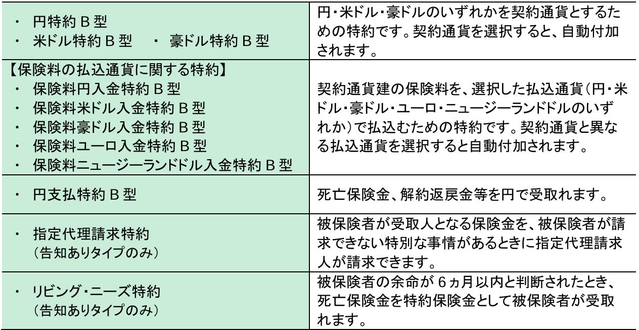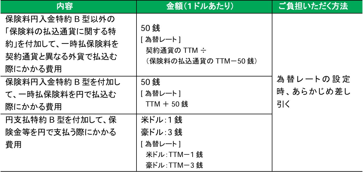 ※ 特約保険料はかかりません。ただし、保険料の払込通貨に関する特約や円支払特約B型を付加し た場合、別途為替手数料がかかります。