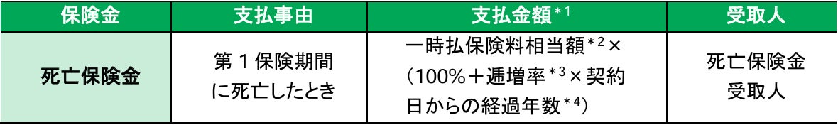 ⚫ 第1保険期間では、契約日の1年後から一時払保険料に対し一定の割合で 死亡保障が毎年増加します。