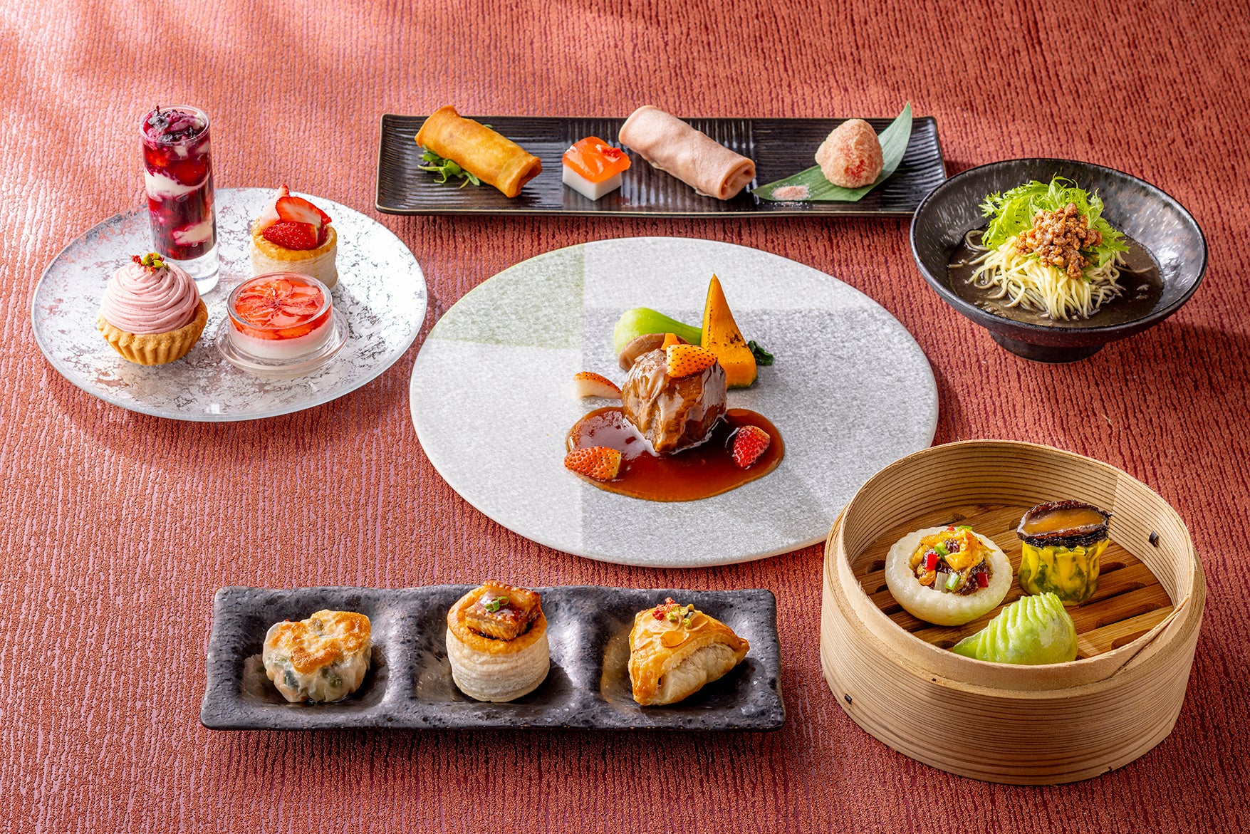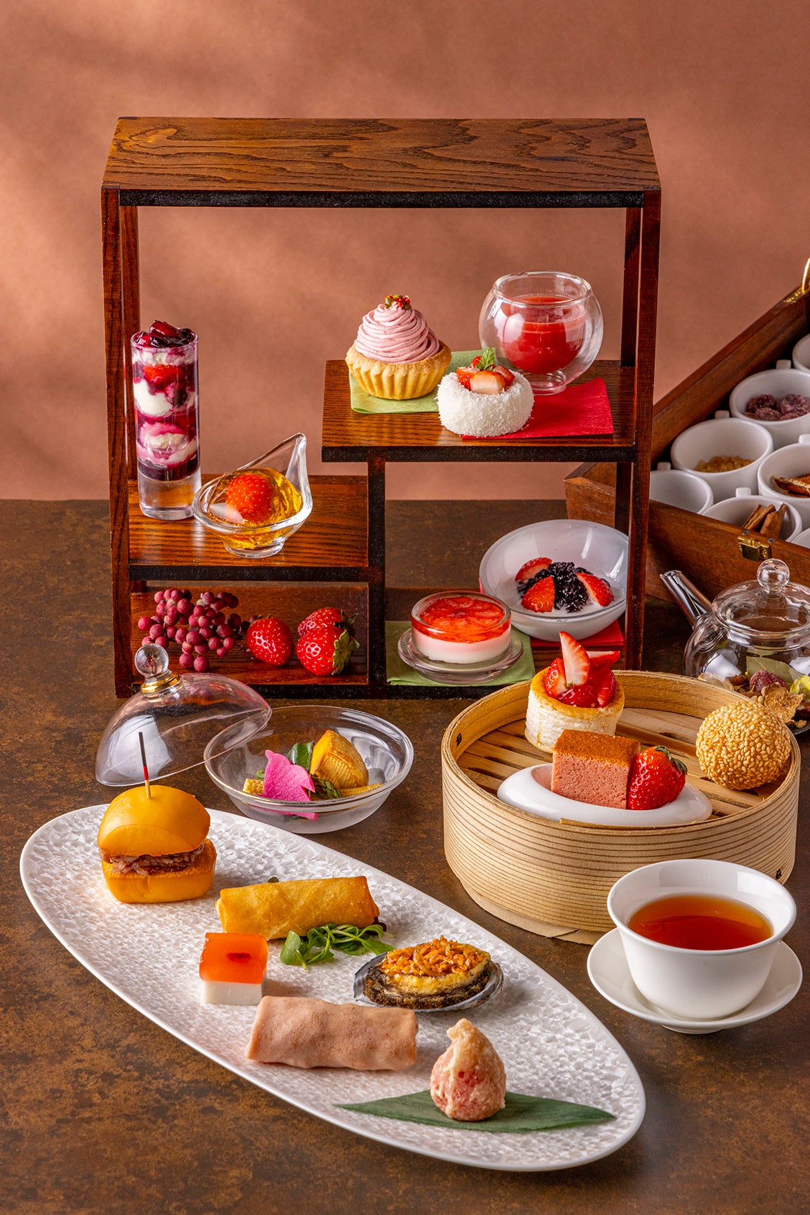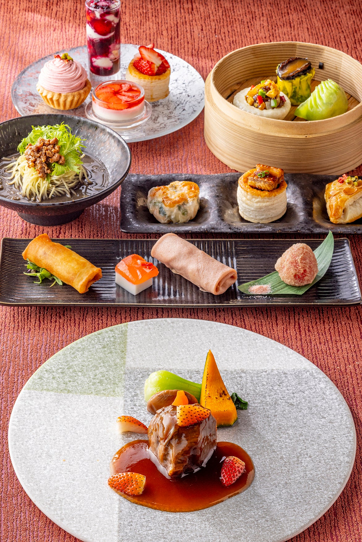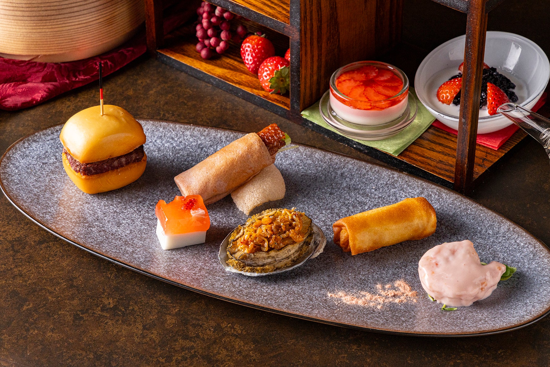 なかでも人気のアフタヌーンティーは、 10種のチャイニーズスイーツすべてにいちごをつかい、黒毛和牛や鮑など贅沢な味わいのセイボリーとともに、旬を味わいつくすメニューをお愉しみいただけます。