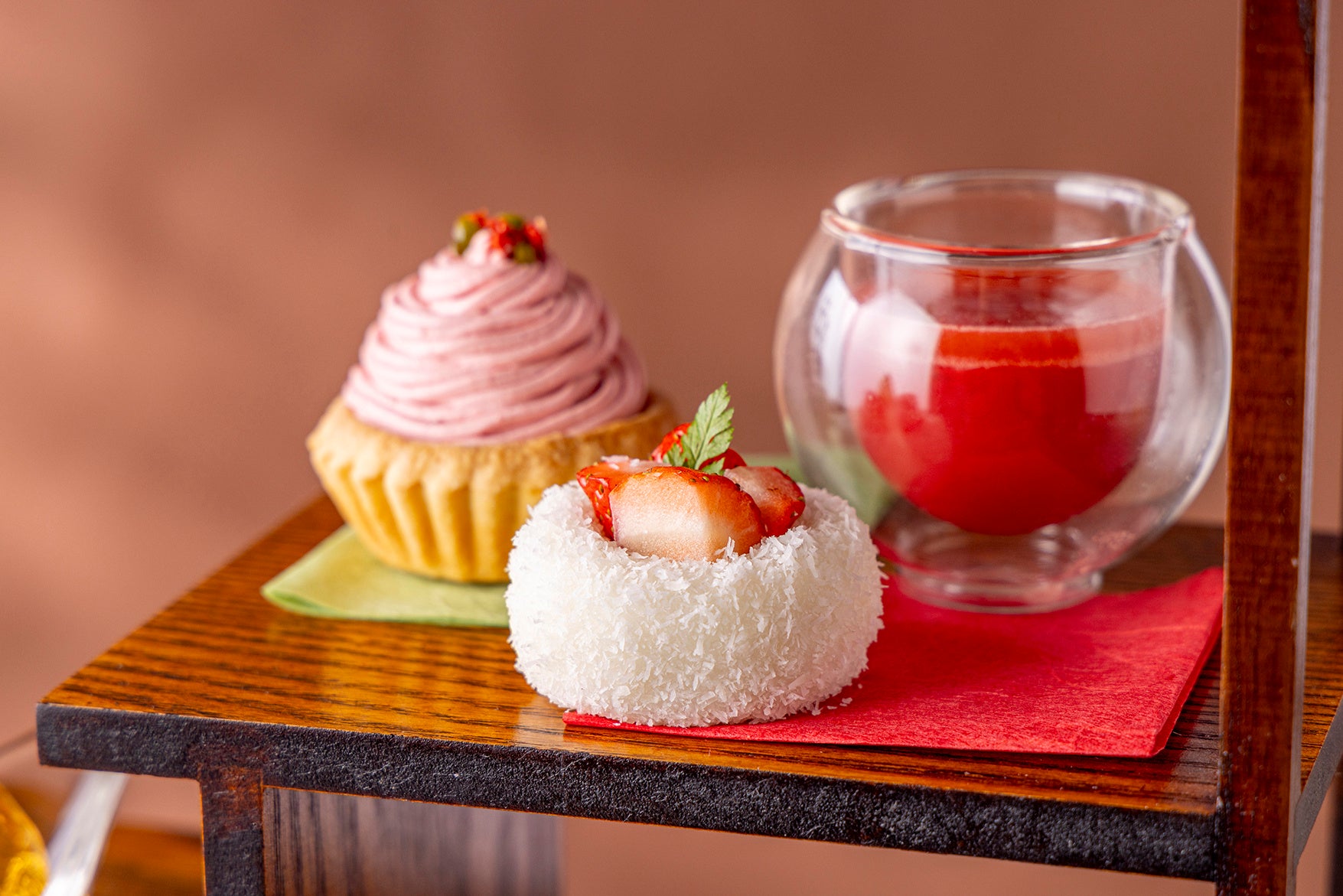 甘酸っぱくジューシーないちごを10種のスイーツすべてにつかい、セイボリーにもいちごフレーバーのアクセントを効かせた、まさにいちごづくしなアフタヌーンティー。苺のモンブランタルトやまるごといちごをとじ込めた杏露酒のゼリーなど、優しい甘さのチャイニーズスイーツばかりです。