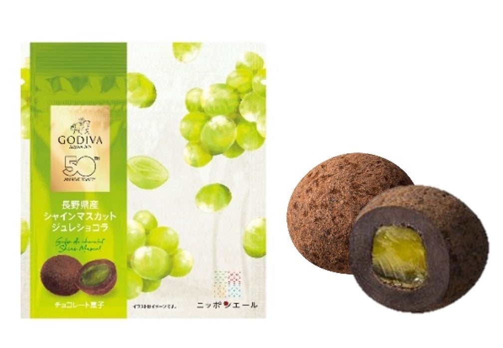 芳醇な香りの長野県産シャインマスカット果汁を使用したジュレを、ベルギー産のカカオ分58%のダークチョコレートでコーティング。