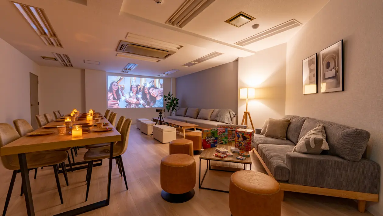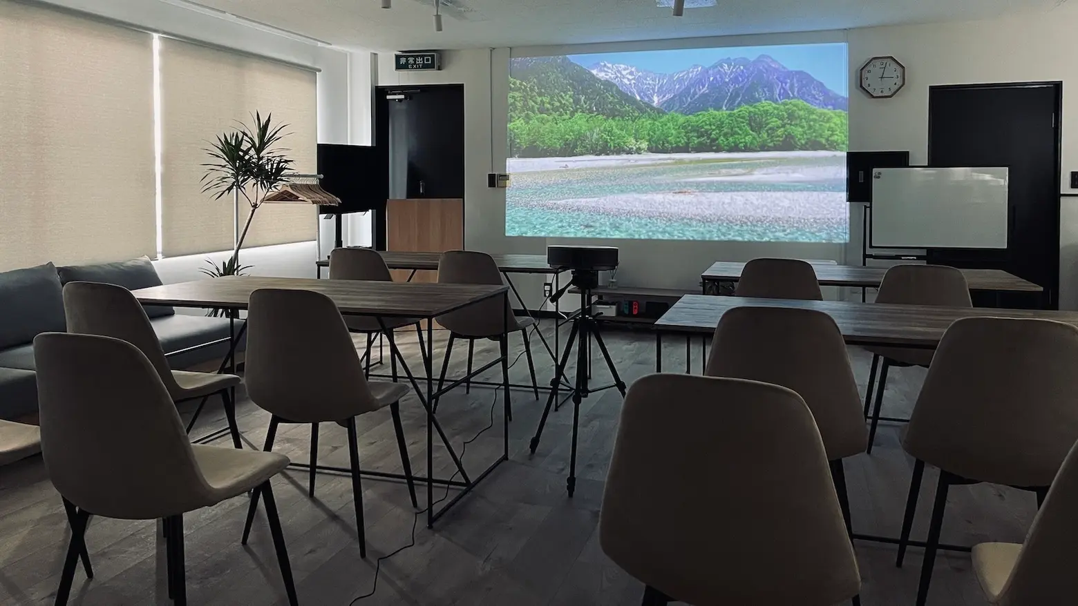 広々空間で大型スクリーン、ワイレスマイクなどの機材も完備!