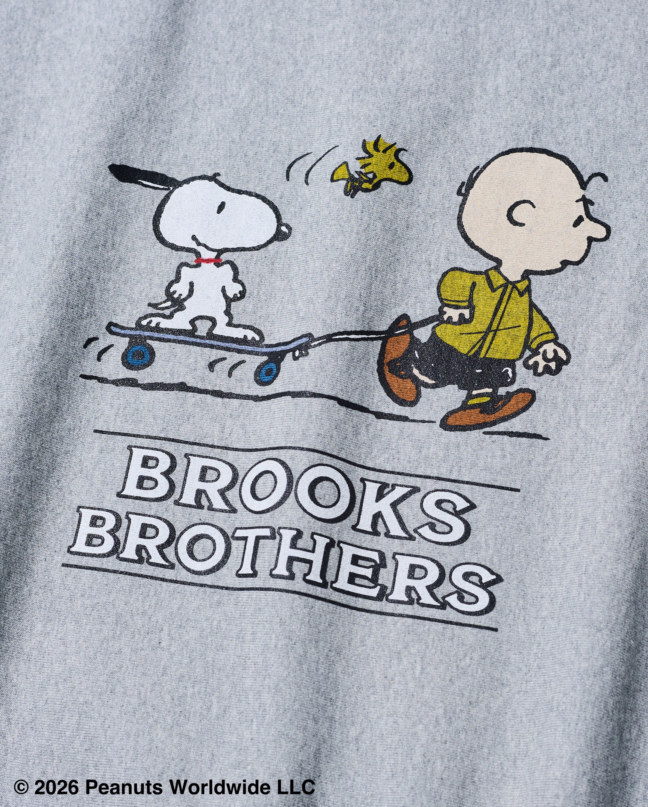 スケートボードに乗ったスヌーピーを、黄色いシャツを着たチャーリー・ブラウンが引っ張るユーモラスなプリントが特徴です。大きなモチーフながら落ち着いた印象に仕上げました。背身頃の襟元にはブルックス ブラザーズのロゴ刺繍をあしらっています。
