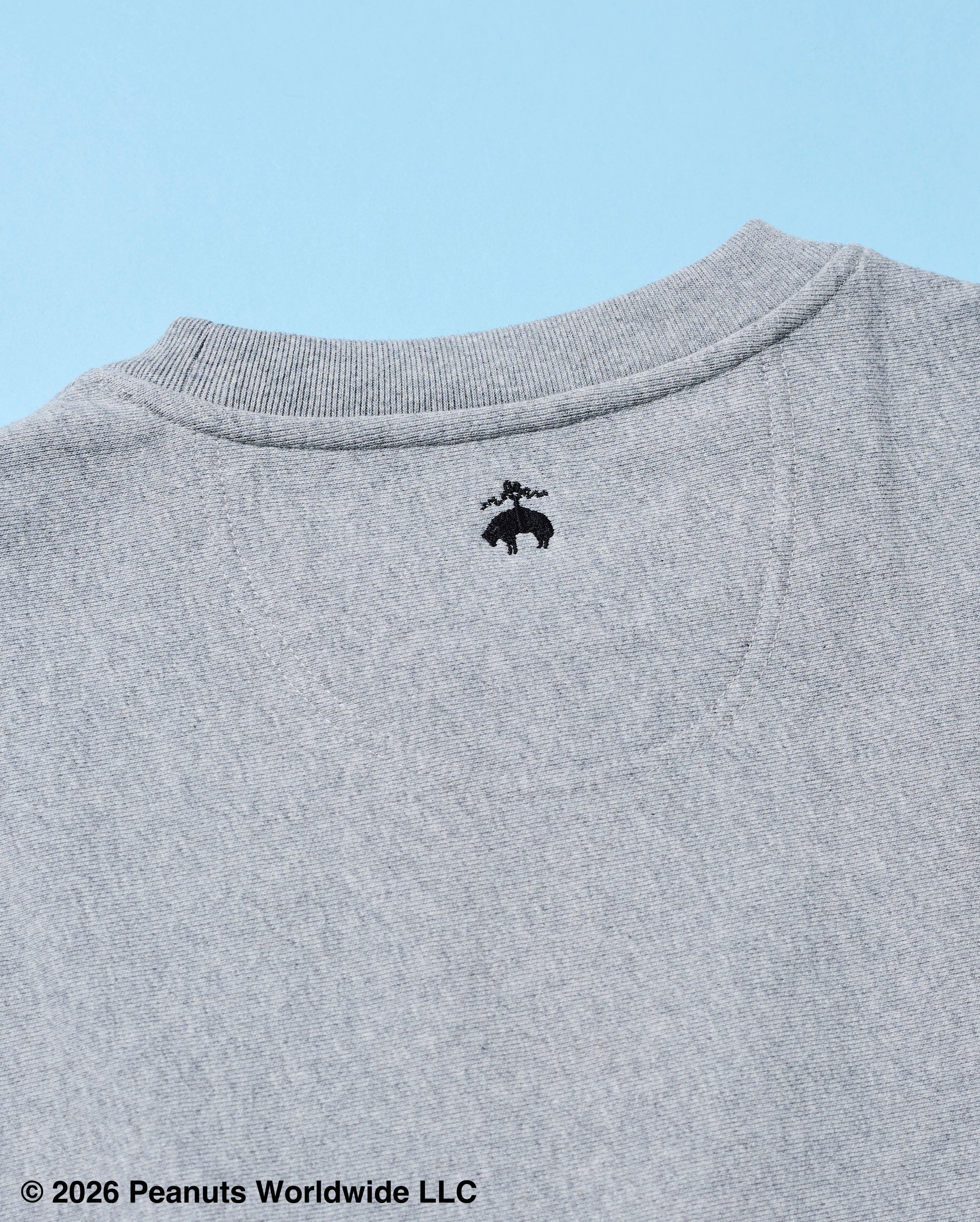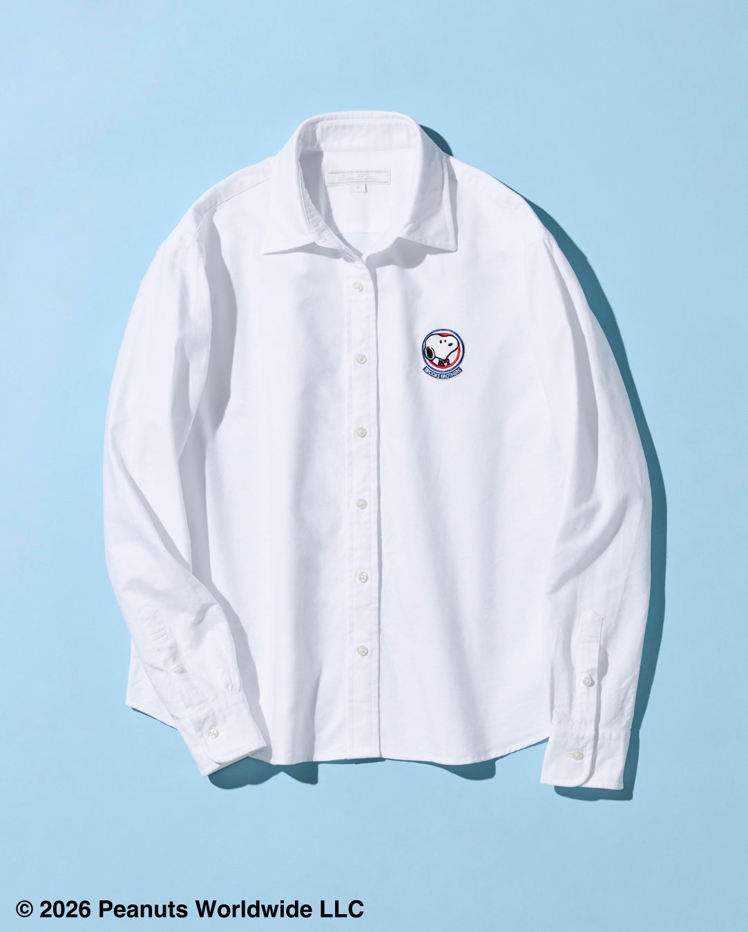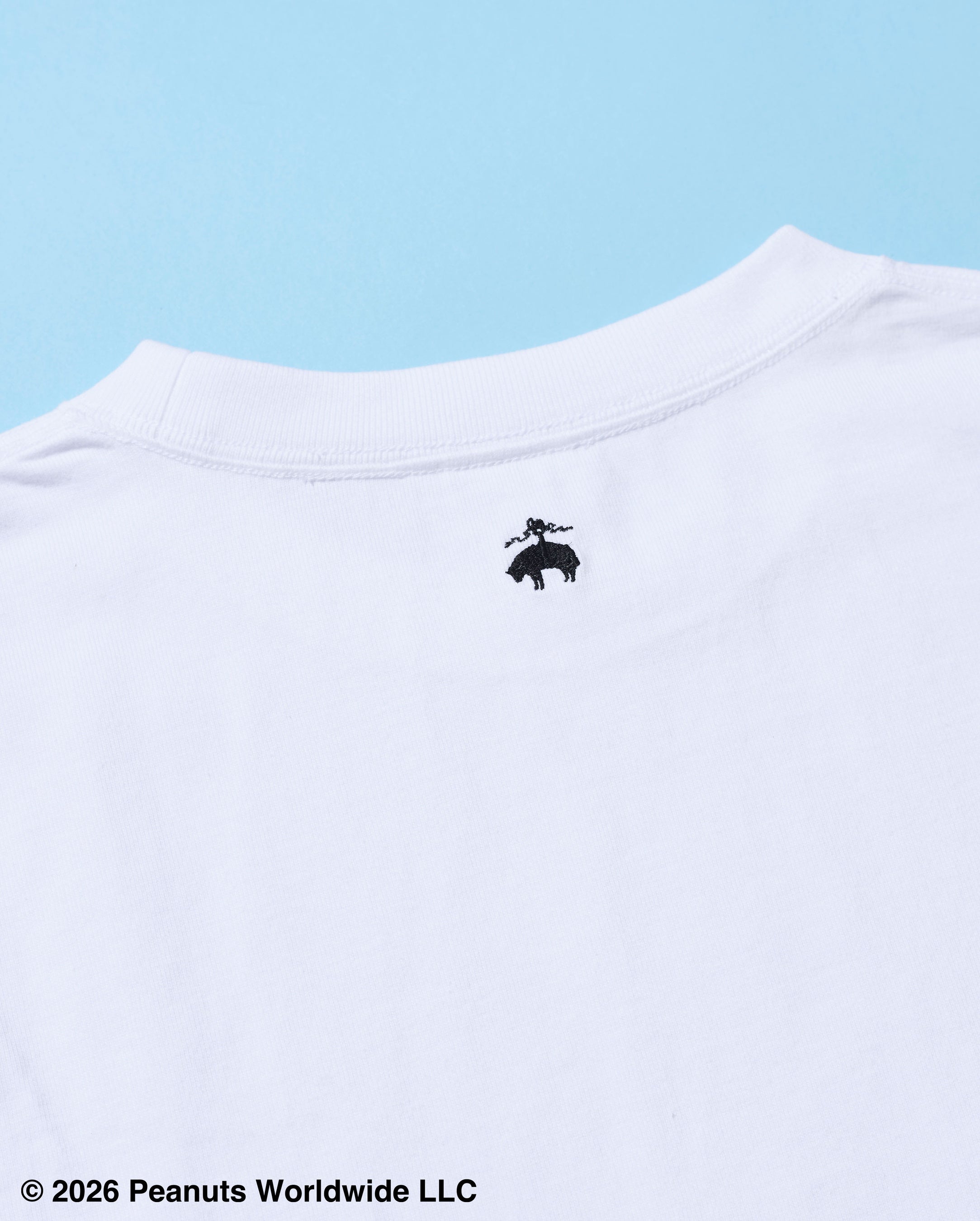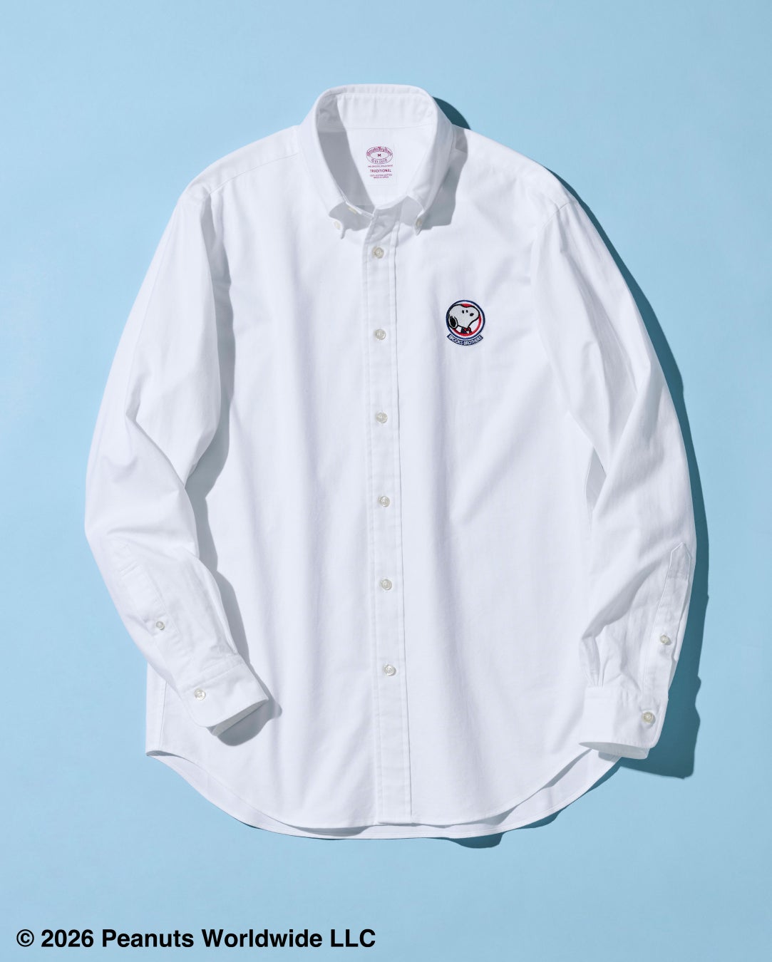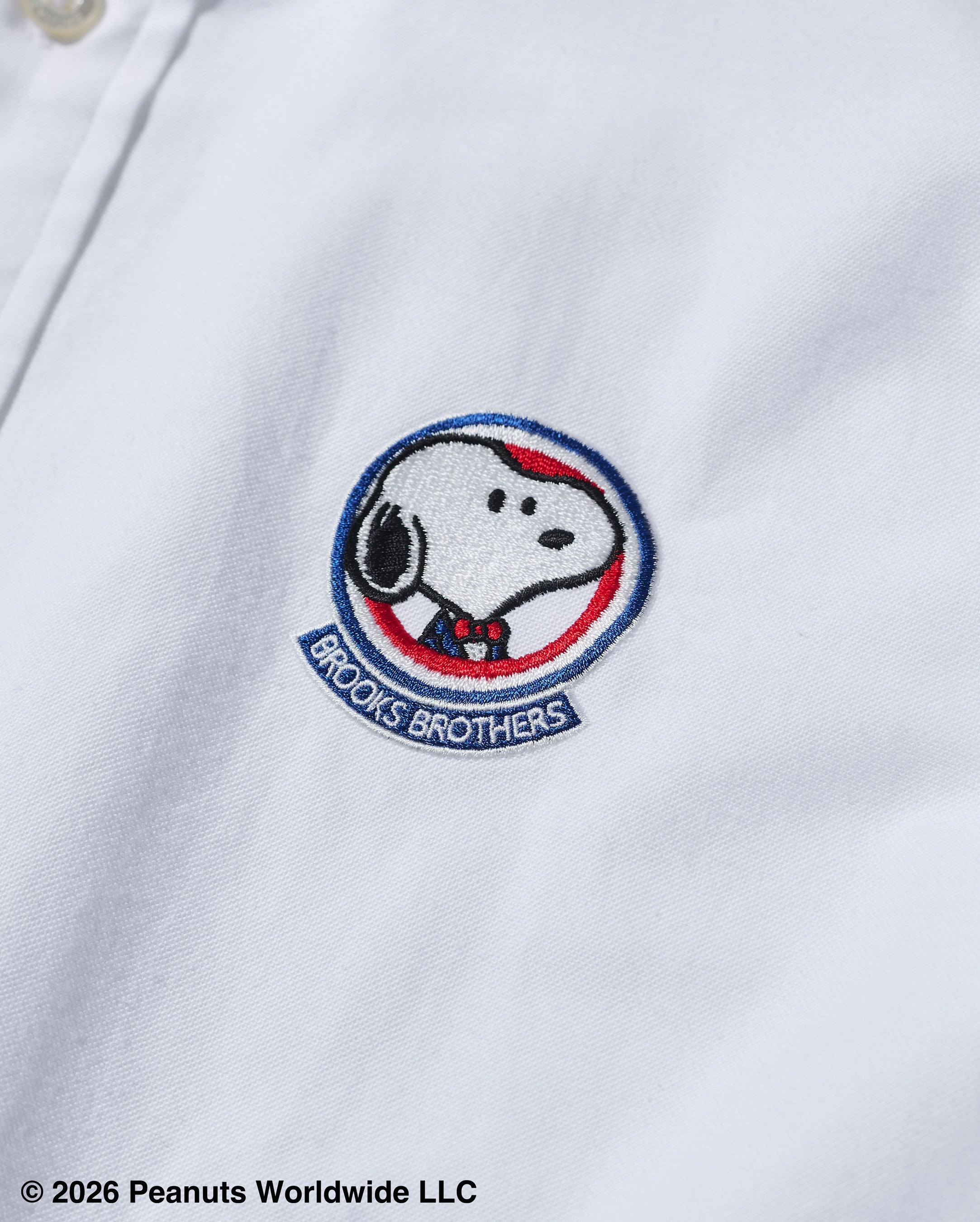 左胸には、紺ブレザーにボウタイを身につけたスヌーピーを、丸いフレームに収めたエンブレム風の刺繍を配置しました。フレーム下部にはブルックス ブラザーズのブランドネームを刻み、クラシックな佇まいの中に特別感をプラス。オン・オフ問わず活躍する一着です。