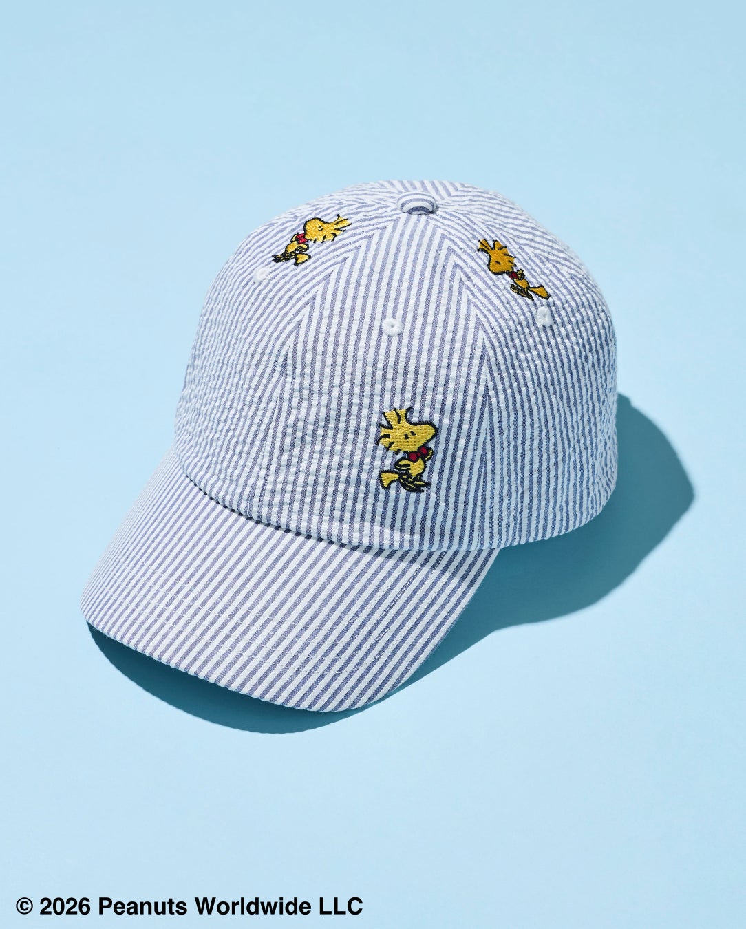 シアサッカー生地に、ウッドストックの刺繍を散りばめた軽やかなキャップ。