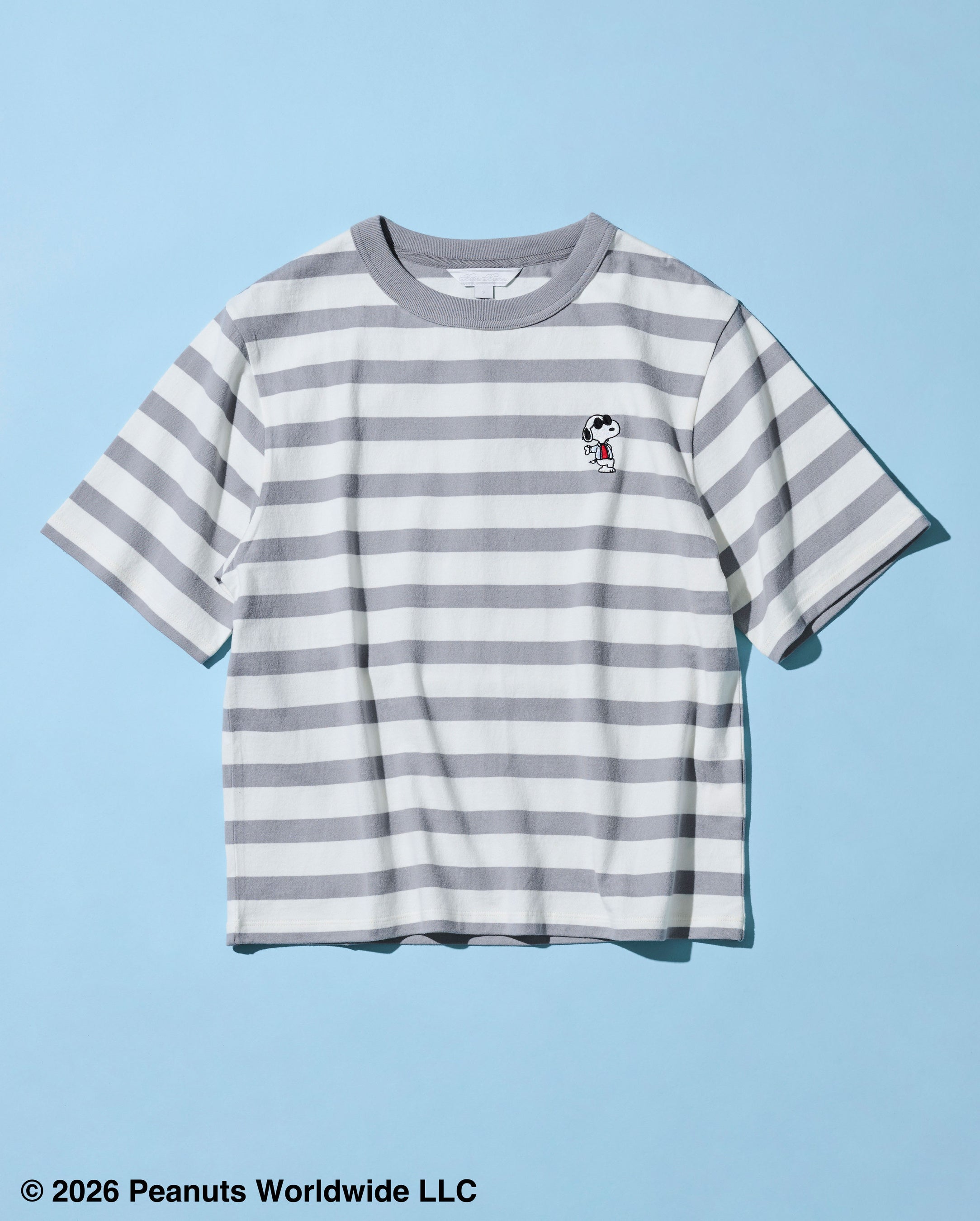 カラフルなシャツをまとったスヌーピーと仲間たちを描いたプリントが目を引く、SSシーズンらしい一枚です。本コラボレーションならではの限定デザインで、シンプルなスタイリングのアクセントに。ジャケットのインナーとしても、一枚着としても存在感を発揮します。