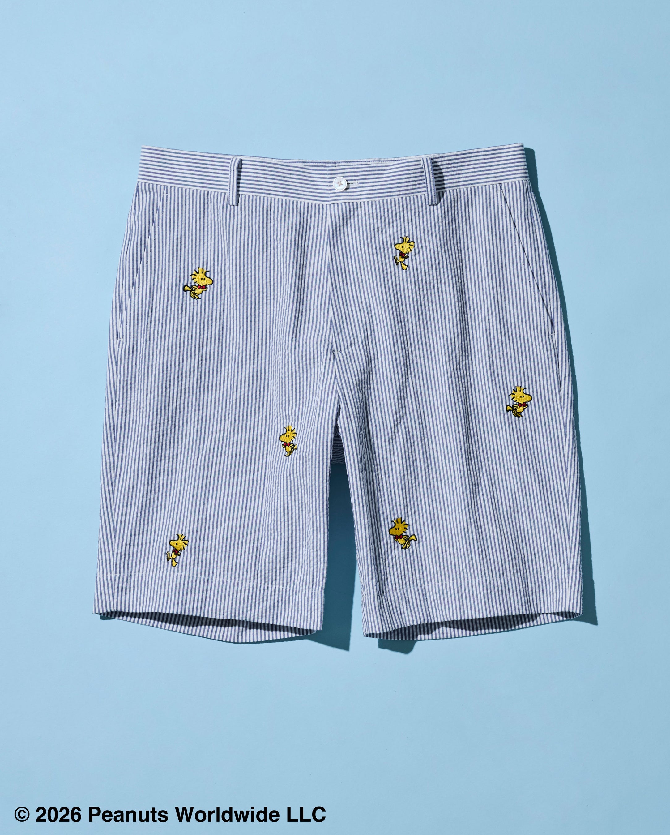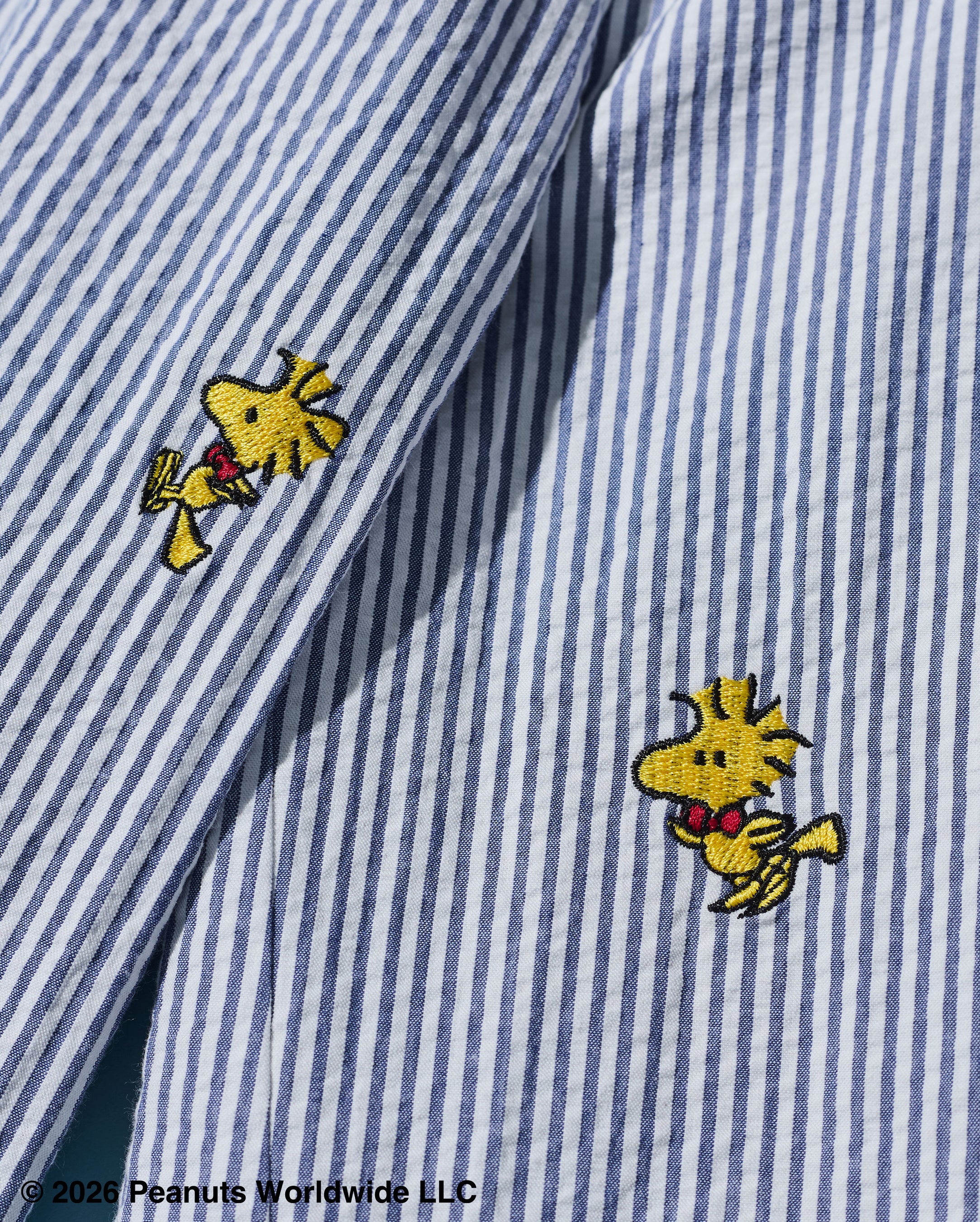 生地の凹凸により肌離れがよく、汗ばむ季節でも快適な着心地を保ちます。ブルー×ホワイトのストライプ柄は爽やかで、軽快な印象に。全体に散りばめられたウッドストックの刺繍が、コラボレーションならではの遊び心を演出します。同組織のタイや同素材のキャップとのスタイリングもおすすめです。