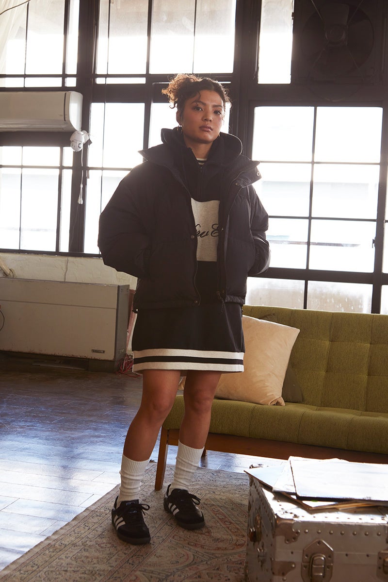 ショート丈のダウンジャケット。同コンセプトでデザインしたメンズのダウンジャケットとのシミラーコーデも可能。