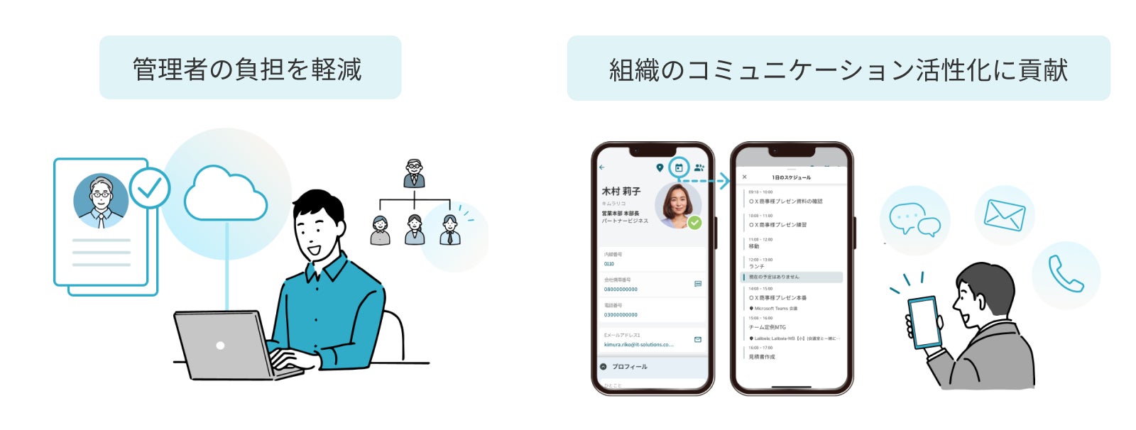 「PHONE APPLI PEOPLE」を通じて、従業員が互いのプロフィールを閲覧できる仕組みを整えることで、チーム内の心理的安全性を高め、共通点やロールモデルを見つける機会に加えて、従業員自身が潜在的なスキルに気づき、自己認識を深めるきっかけを提供します。また、多様なコミュニケーション手段によりスムーズな交流を可能にし、自律的なコラボレーションが生まれる環境を形成します。これにより、組織内の風通しを良くし、従業員エンゲージメントの向上、キャリアデザインの支援、さらには管理職や人事部門はスキルや情報を把握しやすくなるため、適切な人材配置や離職防止にも貢献します。