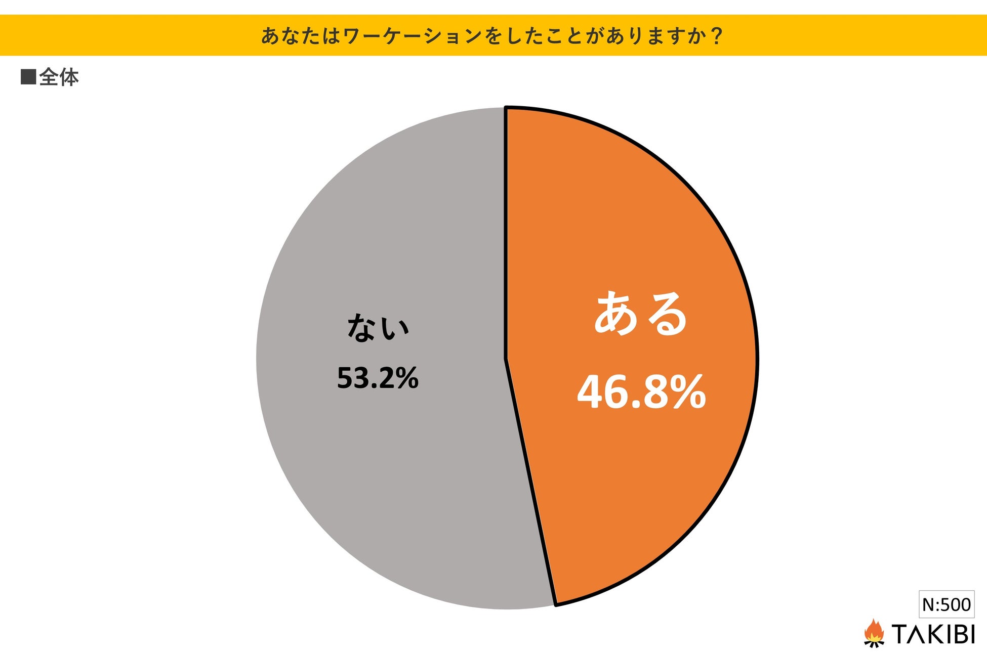 全国の10代~60代の男女を対象とした「あなたはワーケーションをしたことがありますか?」というアンケートを行ったところ、「ある」と回答した方は46.8%という結果になりました。