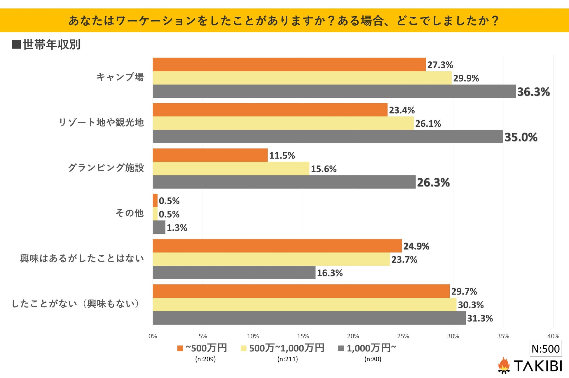 と、世帯年収が上がる毎に、ワーケーション経験率も上がる結果となりました。