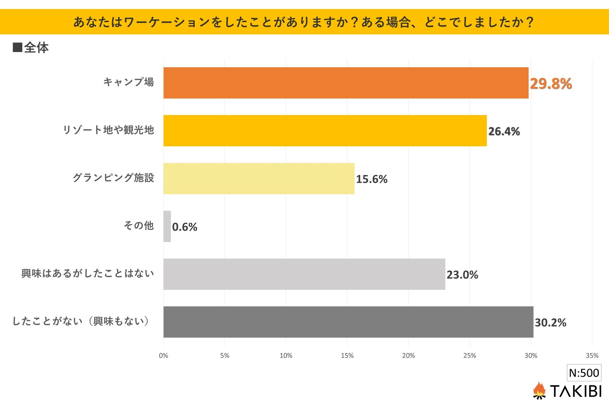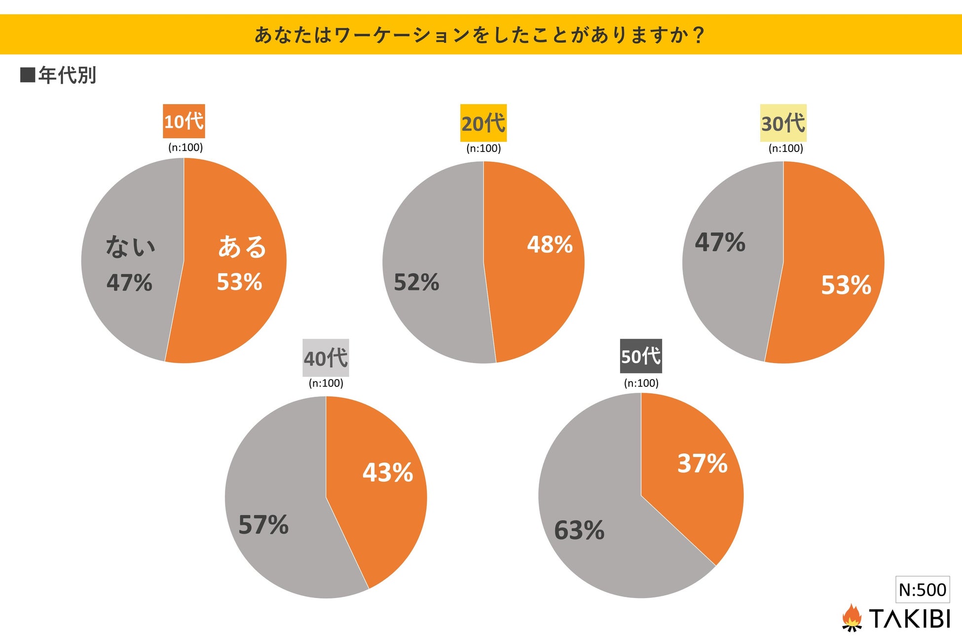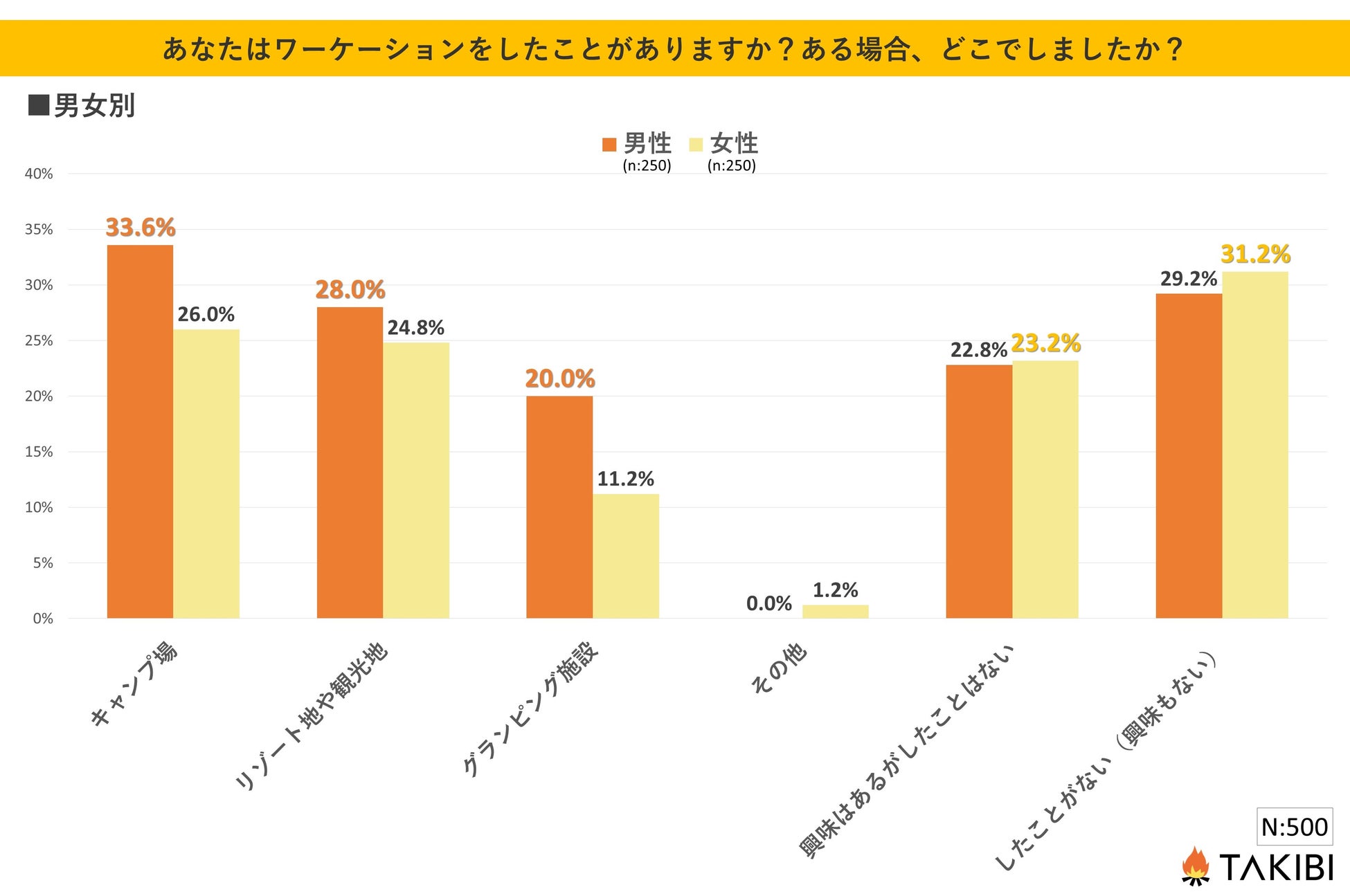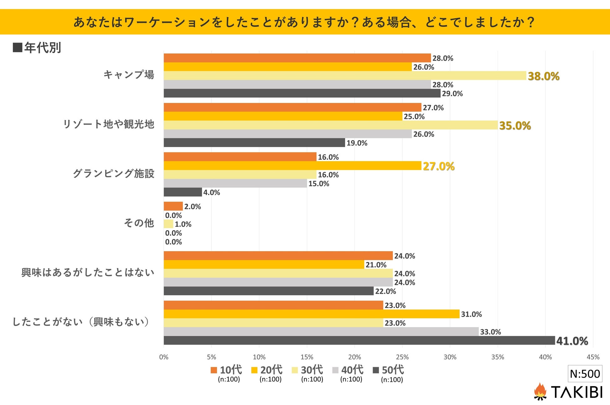 キャンプやグランピングを中心としたアウトドア総合情報サイト「TAKIBI」の運営をおこなう株式会社フォーイットは、全国の10代~50代までの男女500人を対象にワーケーションに関するアンケートを実施し、男女別・年代別等の特徴についてまとめました。
