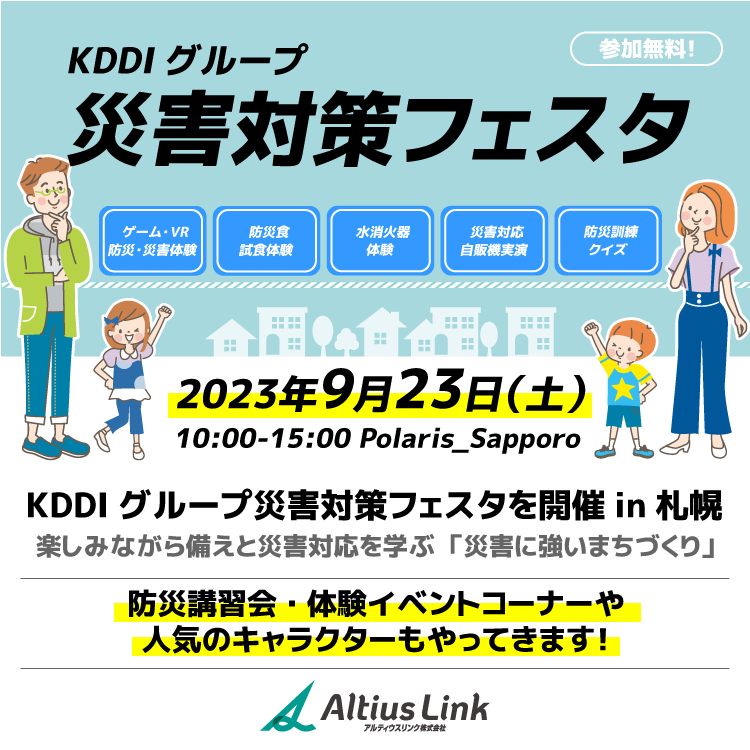 なお、「災害対策フェスタ」は、KDDI株式会社(北海道総支社)および、KDDIエンジニアリング株式会社、株式会社ジェイコム札幌と共催、北海道札幌市に後援いただいております。