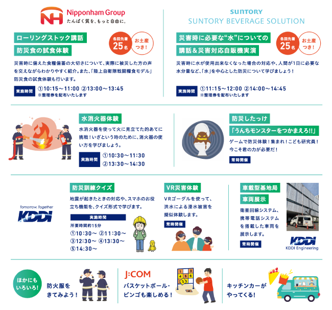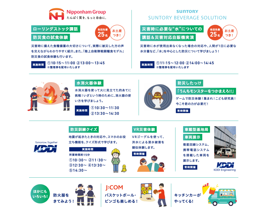 また、日本ハム株式会社による「食料備蓄の紹介と防災食の試食体験」や、サントリービバレッジソリューション株式会社による「水が使用できない場合の対応策と災害対応自販機のデモンストレーション」、札幌市防災協会と白石消防署による「水消火器体験・防火服試着」など、さまざまな体験をしていただけます。