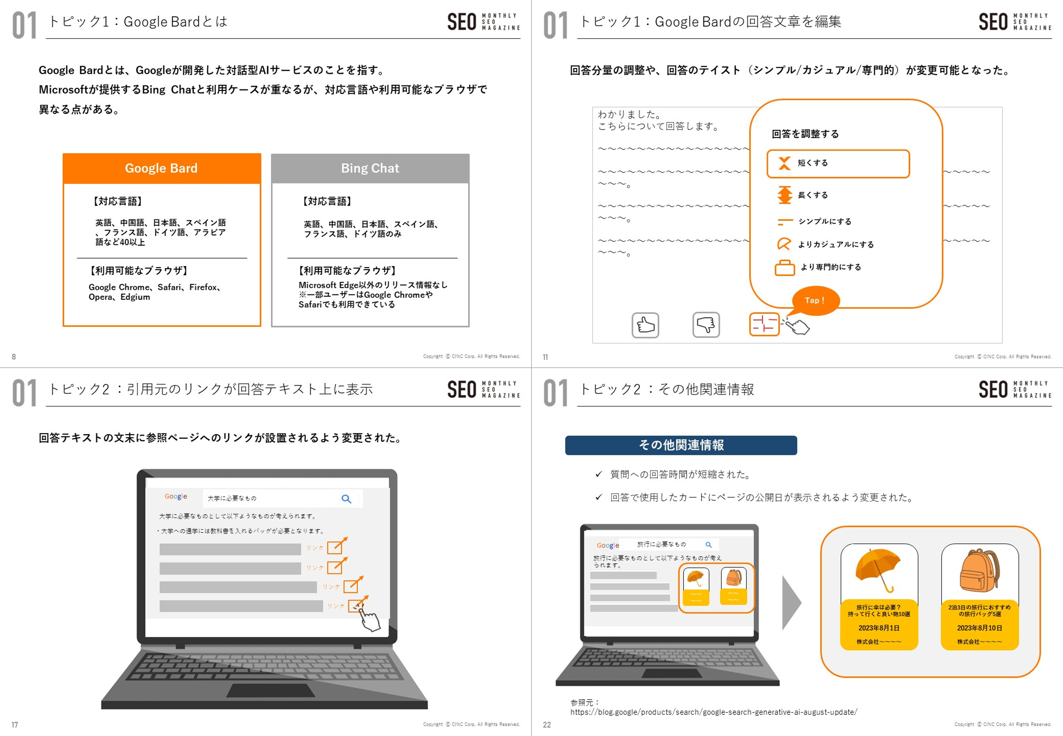 8月号の月刊SEOでは、主にGoogleからのリリース情報をピックアップし解説するとともに推奨アクションを記載しています。