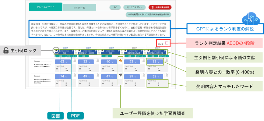 クレームチャートの結果情報を踏まえ、評価A~Dのランクの理由と、GPTが発明提案のための技術的なアドバイスをする機能が搭載されております。