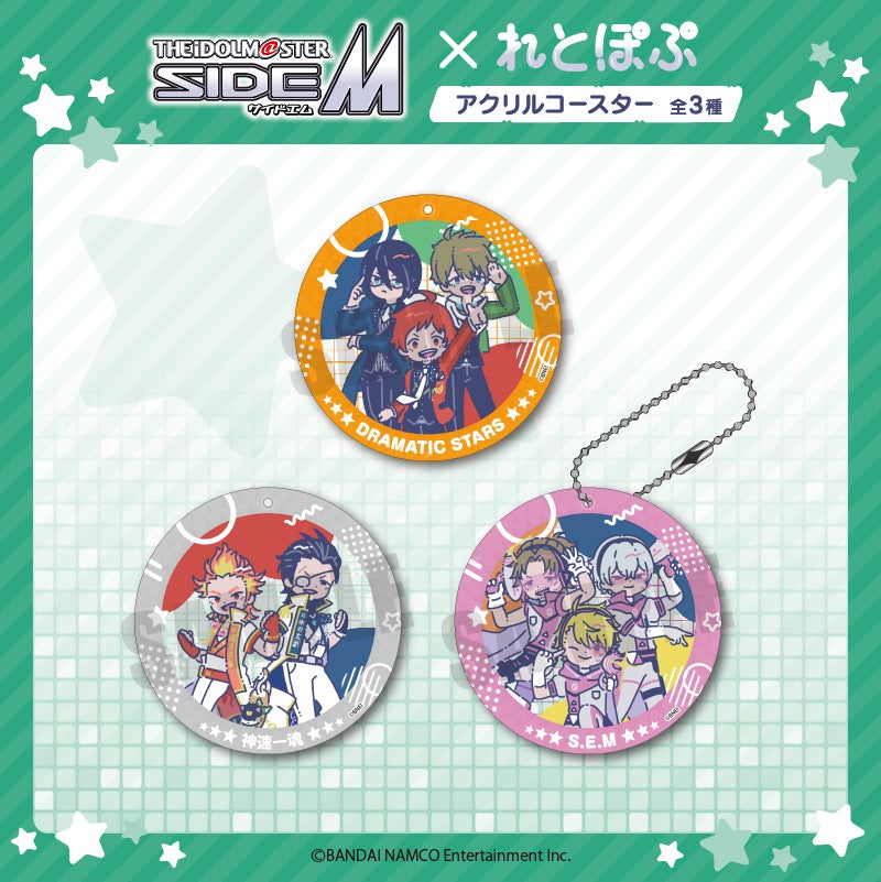 アニメ、ゲームあらゆるジャンルのキャラクター商品や販促グッズの企画、製造、販売をする株式会社プレイフルマインドカンパニー(代表取締役:大塚清隆、本社:東京都台東区)は『アイドルマスター SideM』より、“DRAMATIC STARS“・”神速一魂“・”S.E.M“のアイドルたちを「れとぽぷシリーズ」で描き起こした[ミニアクリルスタンド]や[アクリルキーホルダー]などを3月15日(火)より下記販売サイトにて予約販売を開始致します。