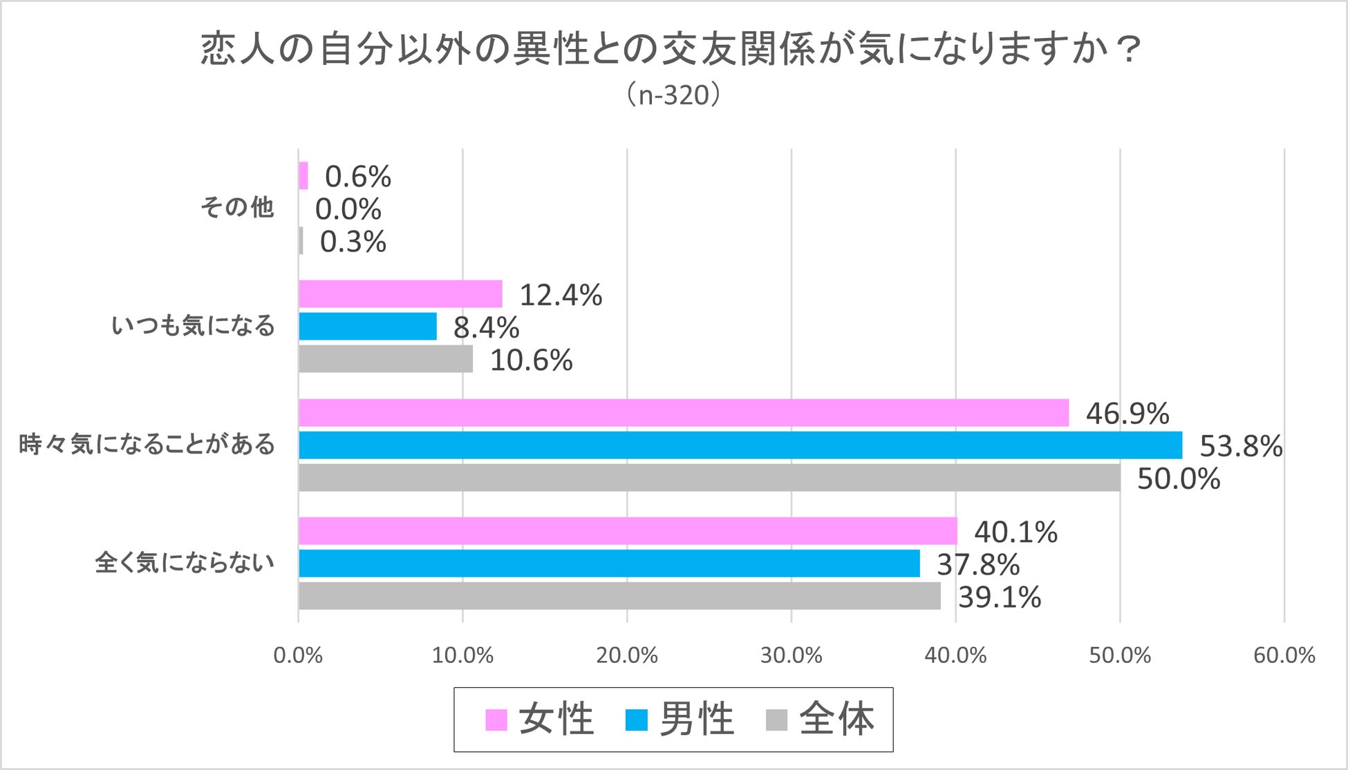 一方で「いつも気になる」という回答は、全体で10.6%、男性8.4%、女性12.4%という回答結果であることから、男女ともに1割前後は恋人の自分以外の異性とのやりとりについて、いつも気にしているということがうかがえる結果となりました。