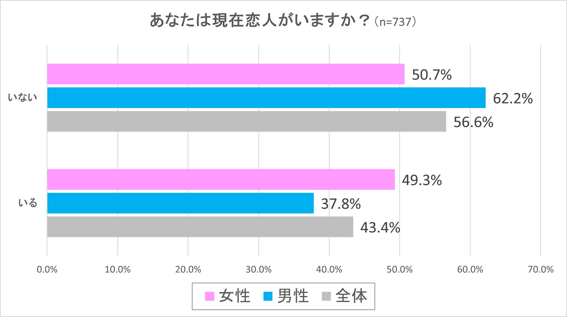 最初の設問では、対象となる独身男女737人に、「あなたは現在恋人がいますか?」という質問を行い、現在お付き合いしている恋人の有無について伺いました。全体では43.4%、男性37.8%、女性49.3%から「現在恋人がいる」という回答結果をえられました。