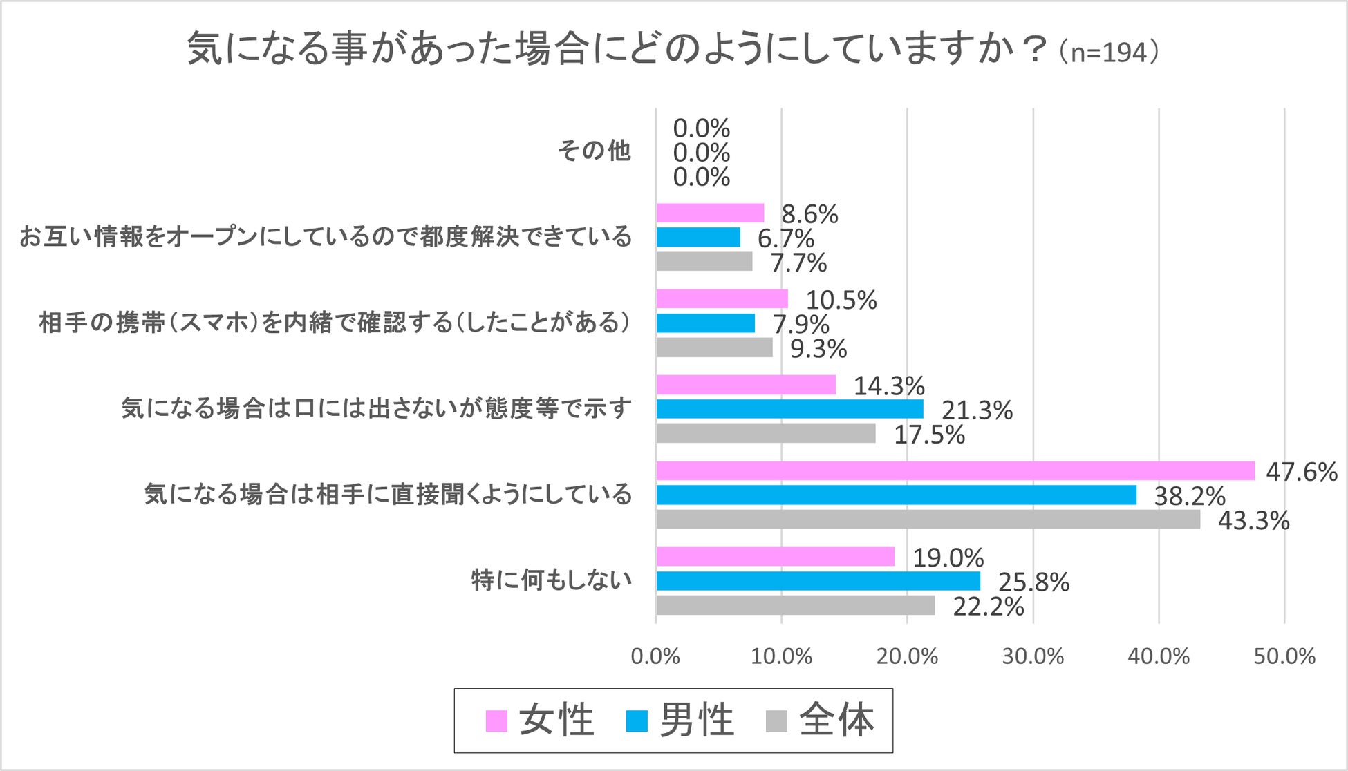 まず、最も多かった回答は「気になる場合は相手に直接聞くようにしている」という回答で、全体で43.3%、男性38.2%、女性47.6%という結果となりました。2番目に多かった回答は「特に何もしない」で、全体22.2%、男性25.8%、女性が19.0%という結果となりました。3番目に多かった回答は、「気になる場合は口には出さないが態度で示す」で、全体では17.5%、男性21.3%、女性14.3%という結果で、男性の回答割合が女性を7ポイントうわまわる結果となりました。4番目は「相手の携帯(スマホ)を内緒で確認する(したことがある)」で、全体では9.3%、男性7.9%、女性10.5%となりました。5番目は「お互い情報をオープンにしているのでその都度解決できている」で、全体で7.7%、男性6.7%、女性8.6%という結果となりました。