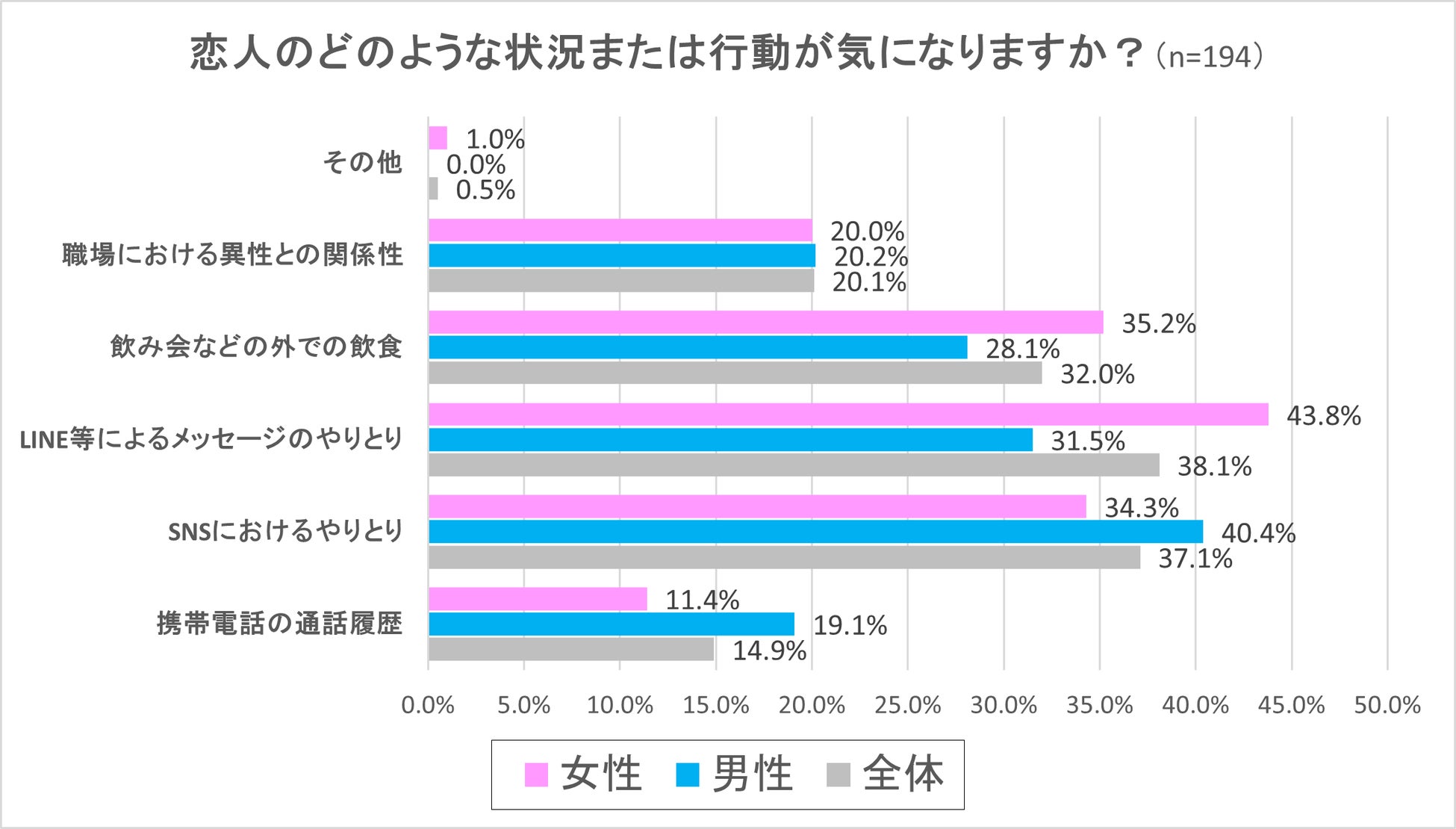 この設問では、前の設問への回答で「時々気になることがある」または「いつも気になる」を選択した男女194人に、「恋人のどのような状況または行動が気になりますか?」という質問を行い2つ迄回答が選択できる形式で集計しました。